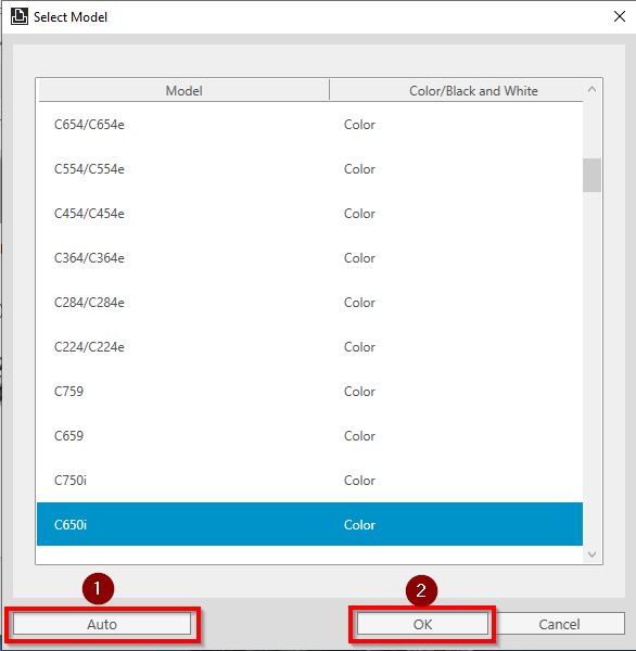 STEP 3(b) Select [Auto] – [OK], make sure the Printer Model is correct under Model then proceed to select [OK] again. Proceed go back to STEP 3 again to key in user authentication. Then click [OK] to save the setting before printing.