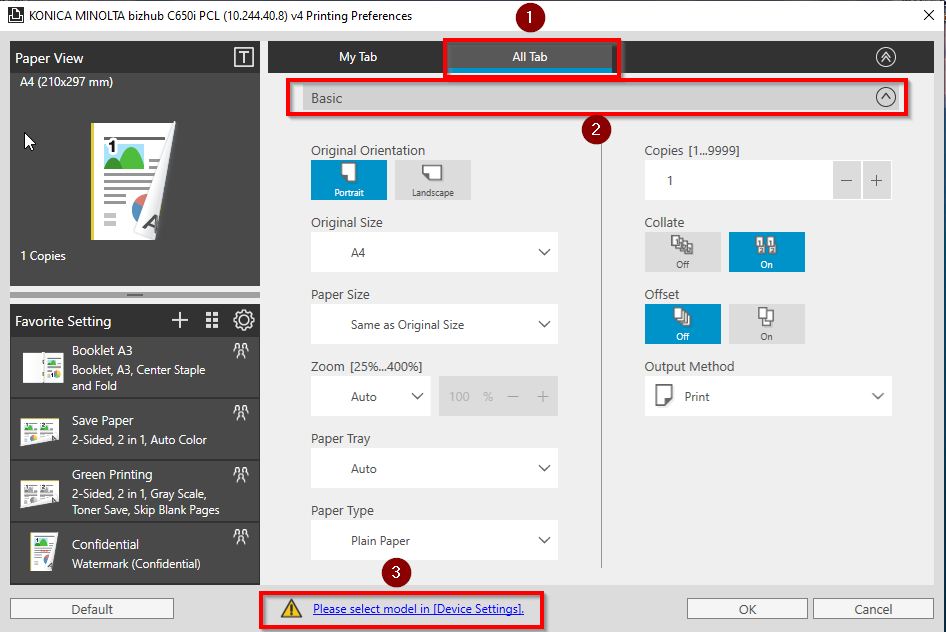 STEP 3(a) Incase [Authentication/Account Track] on STEP 3 is unable to seen as below, kindly proceed to select an option [Please select model in [Device Settings] to adjust machine setting.