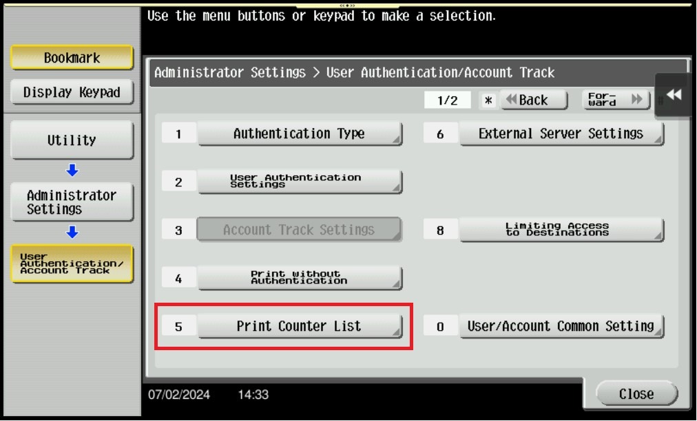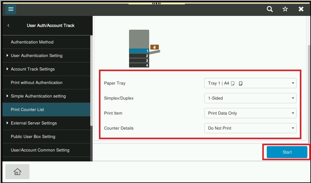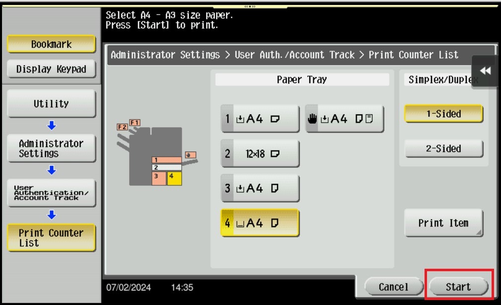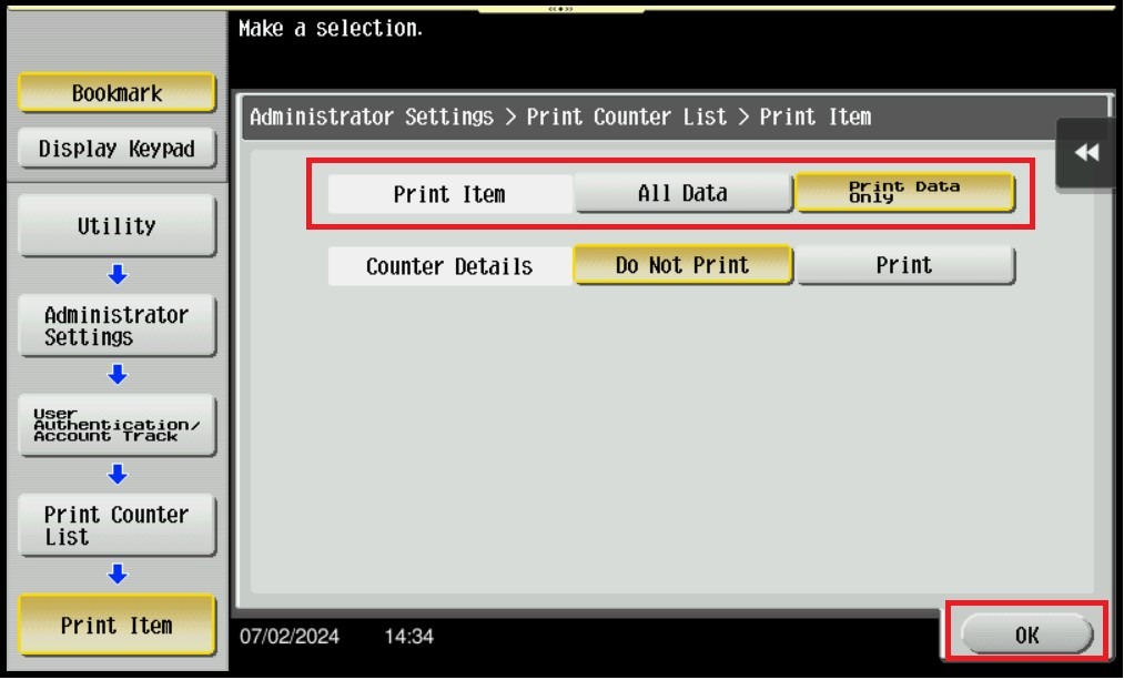 STEP 6 – Select [Print Item] and select [Print Data Only] under Print Item, then click [OK] to print Counter list from machine.