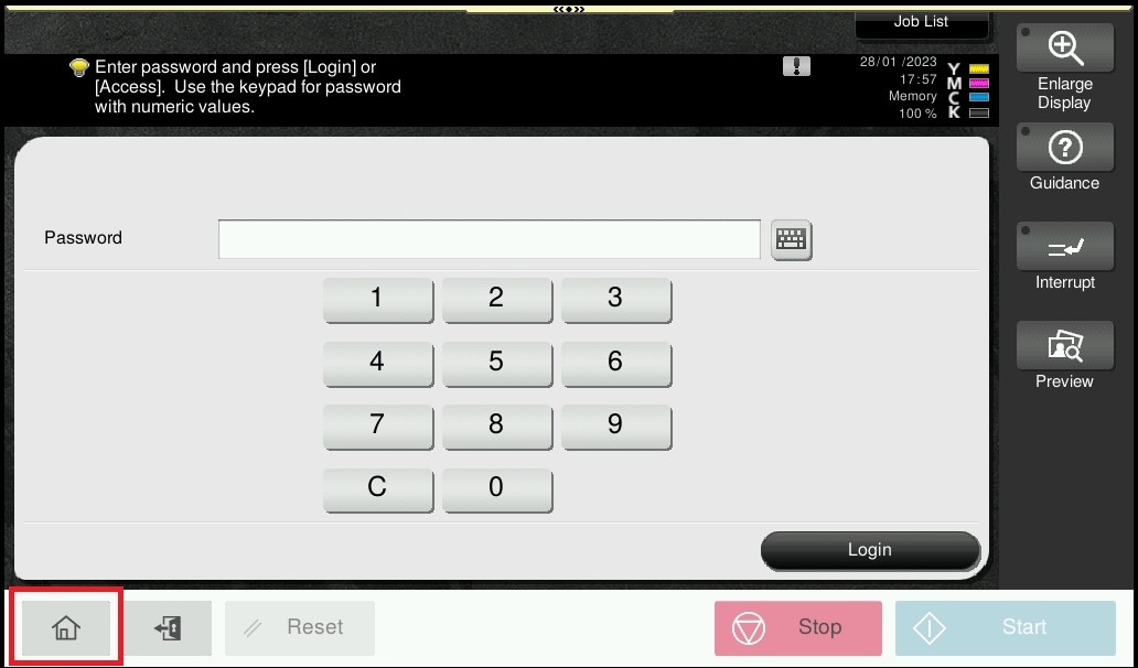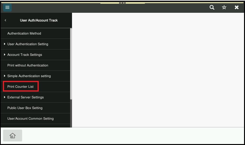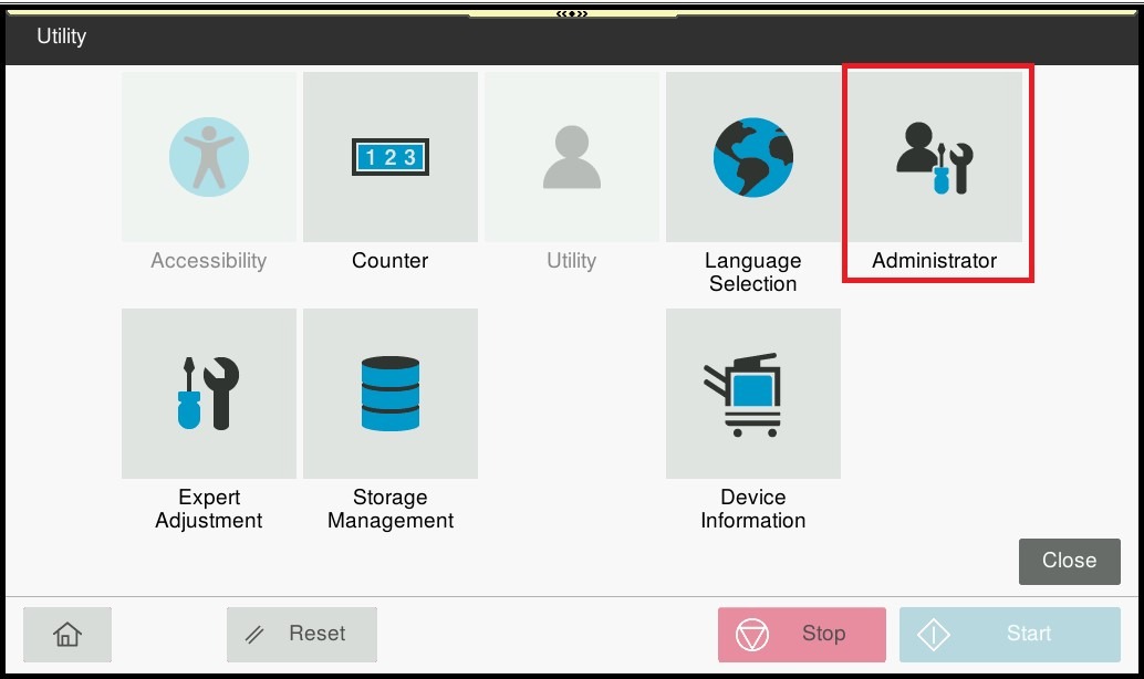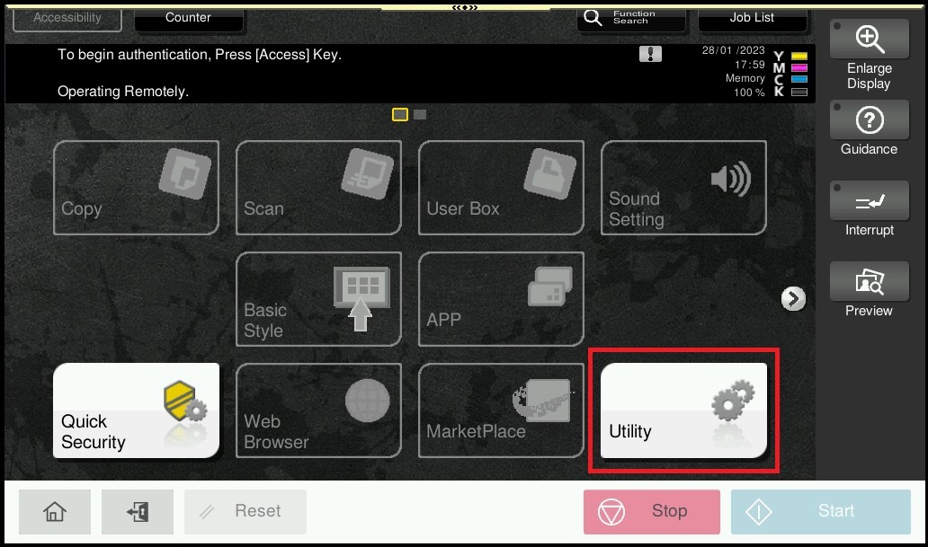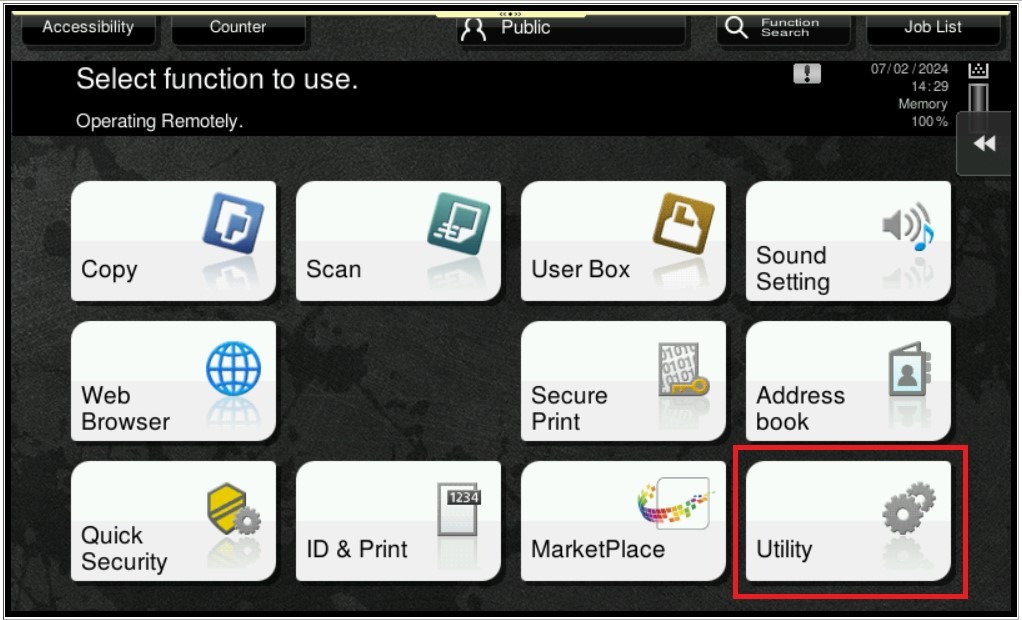 STEP 1 – On the Konica Minolta machine control panel, click on the [Home] button then select [Utility].