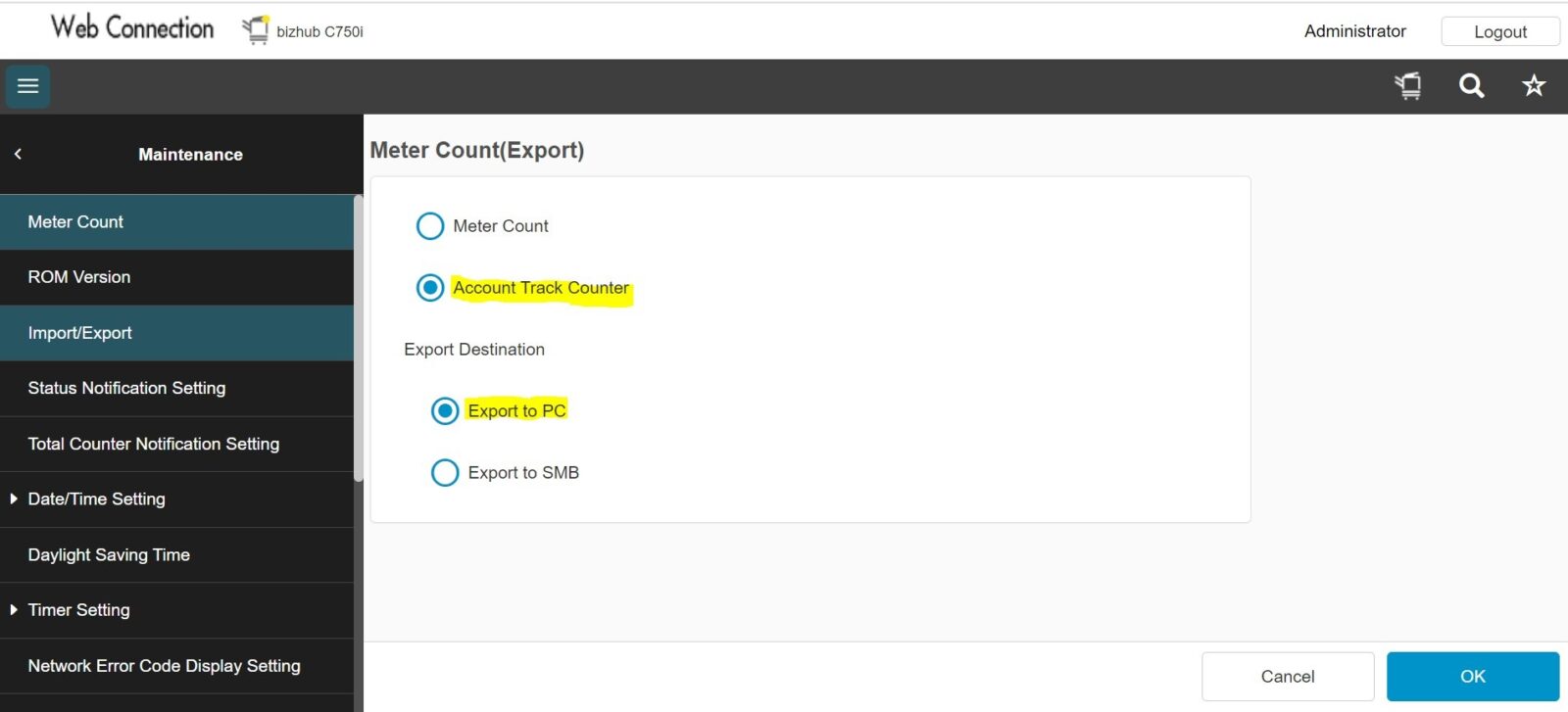STEP 3 – Select [Account Track Counter] – [Export to PC] – then click [OK].