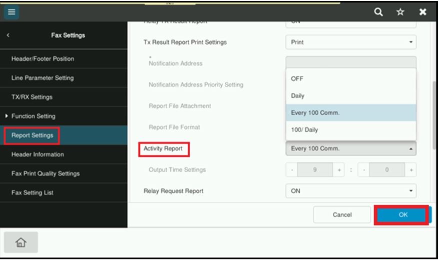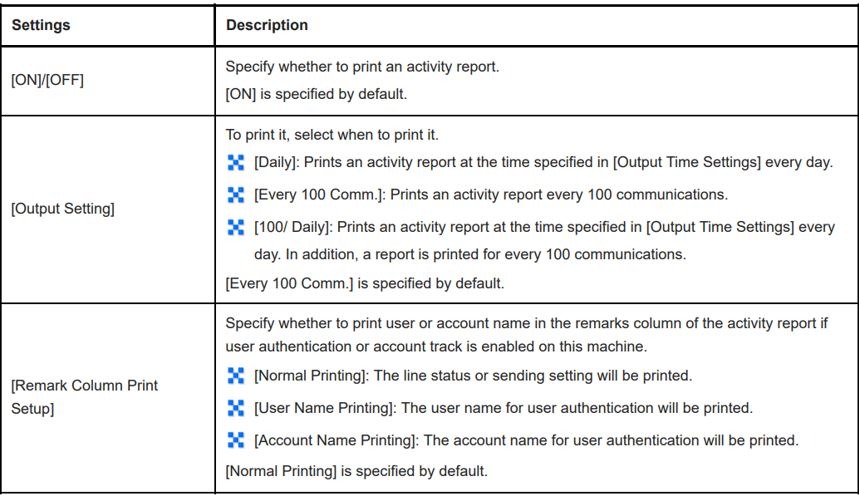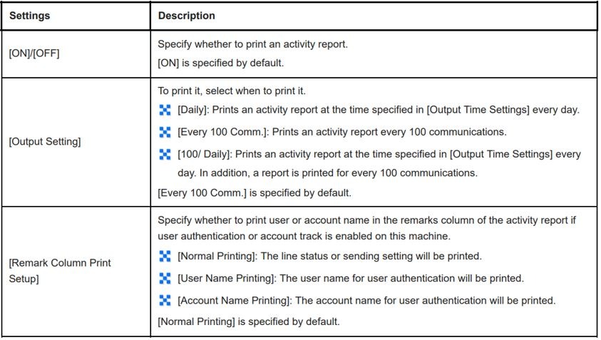 • By default the report is automatically printed for every 100 communications. While the activity report is automatically printed and the records containing only transmission or reception jobs can be printed as required.