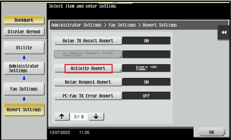 STEP 6 – Click on arrow down key to go to page 2/3, press on [Activity Report] and specify account activity report output conditions.