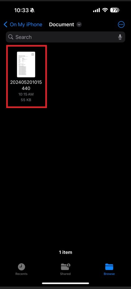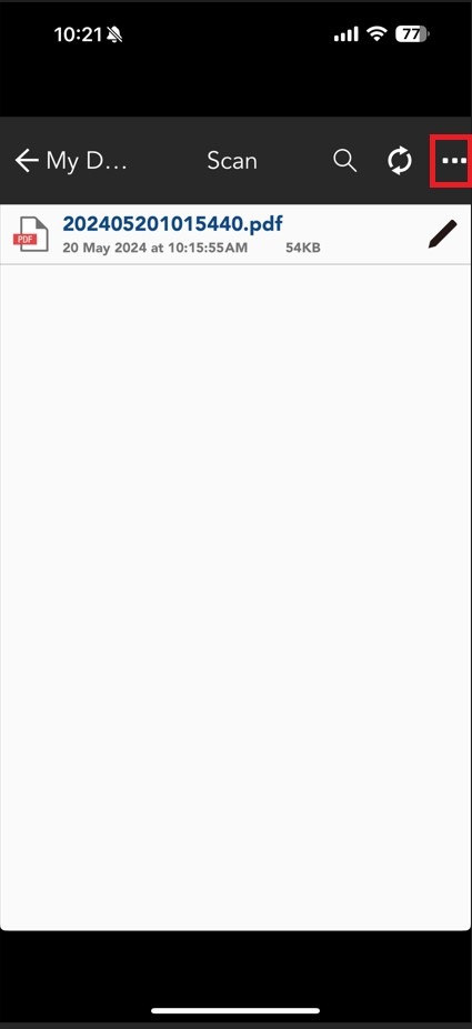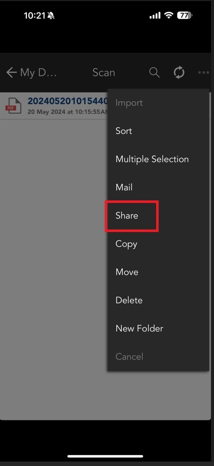 STEP 1 – Select my documents from mobile print, the file that scan will appear, In order to save the scanned document to phone storage, select 3 dot on right hand corner then select [Share].