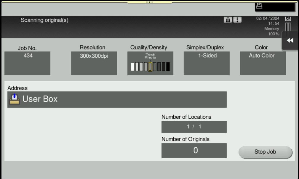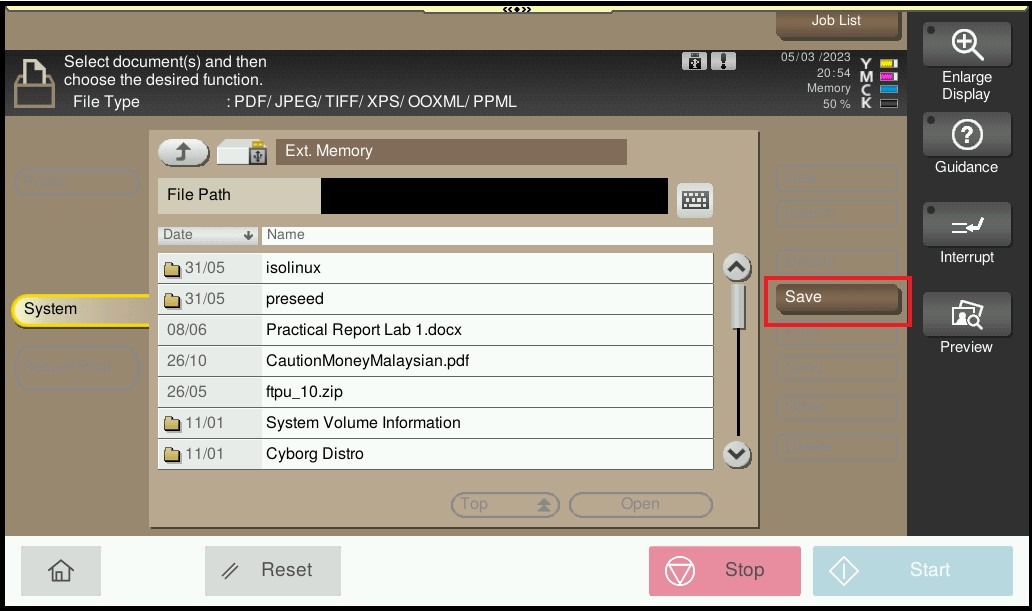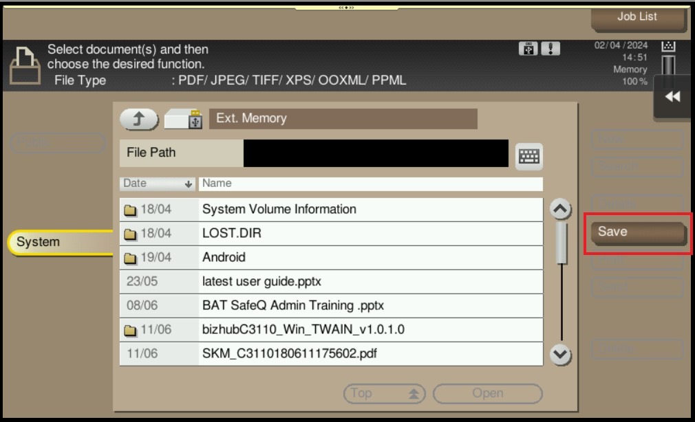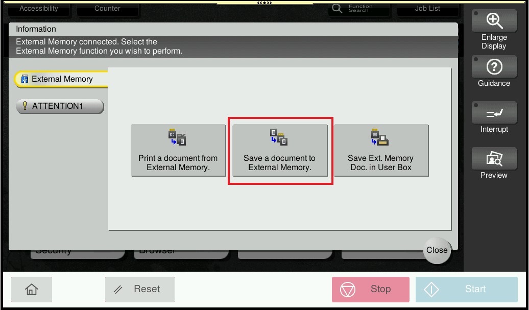 Save a document to External Memory option is available after plugging-in the Thumb Drive on the machine. Incase this option is not available on the machine, kindly follow this step to enable this function and proceed to below step.