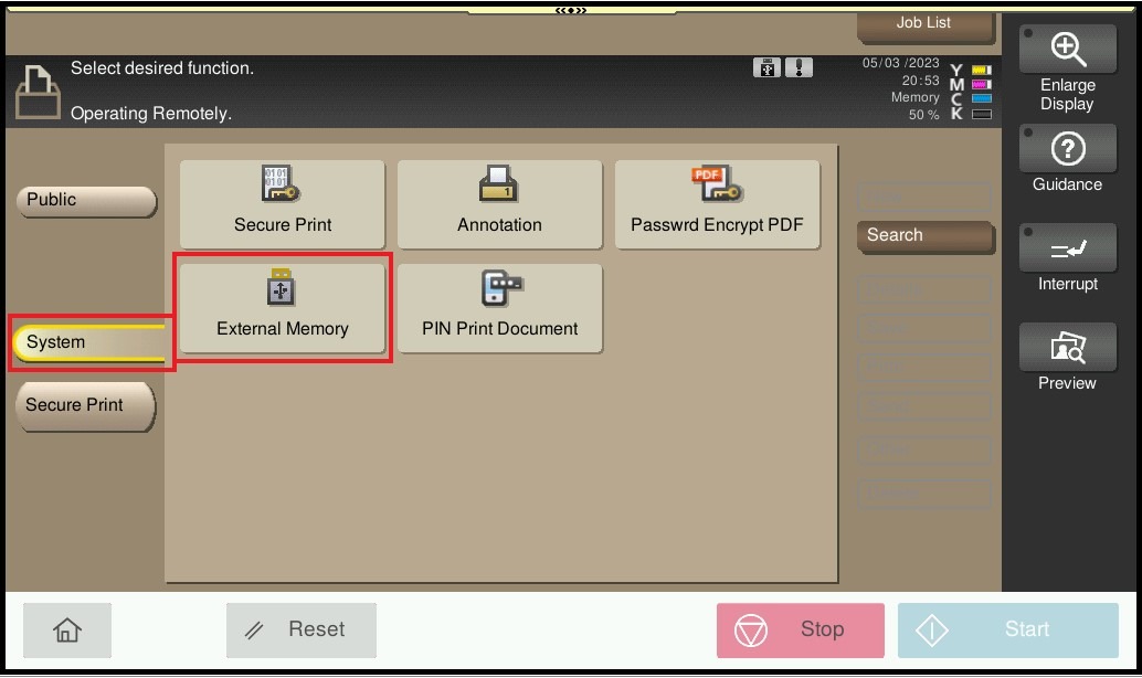 STEP 1(b) – Alternatively, incase the step1(a) dialog not popup, you may proceed to [Menu] – [User Box] – [System] – [External Memory].
