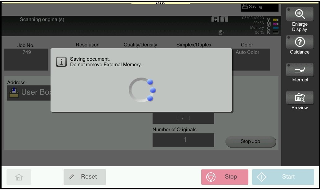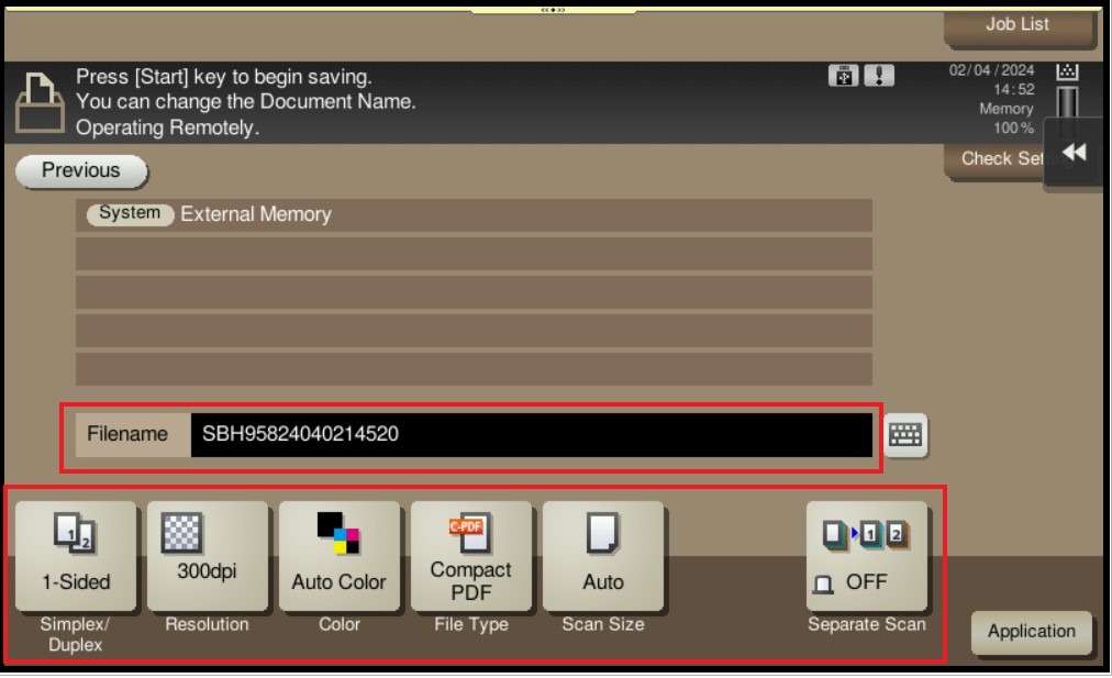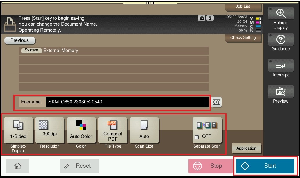 STEP 3 – You may readjust the scan setting/name before scan and press [Start] button after everything has been set. The file will be save in the External Memory after scan.