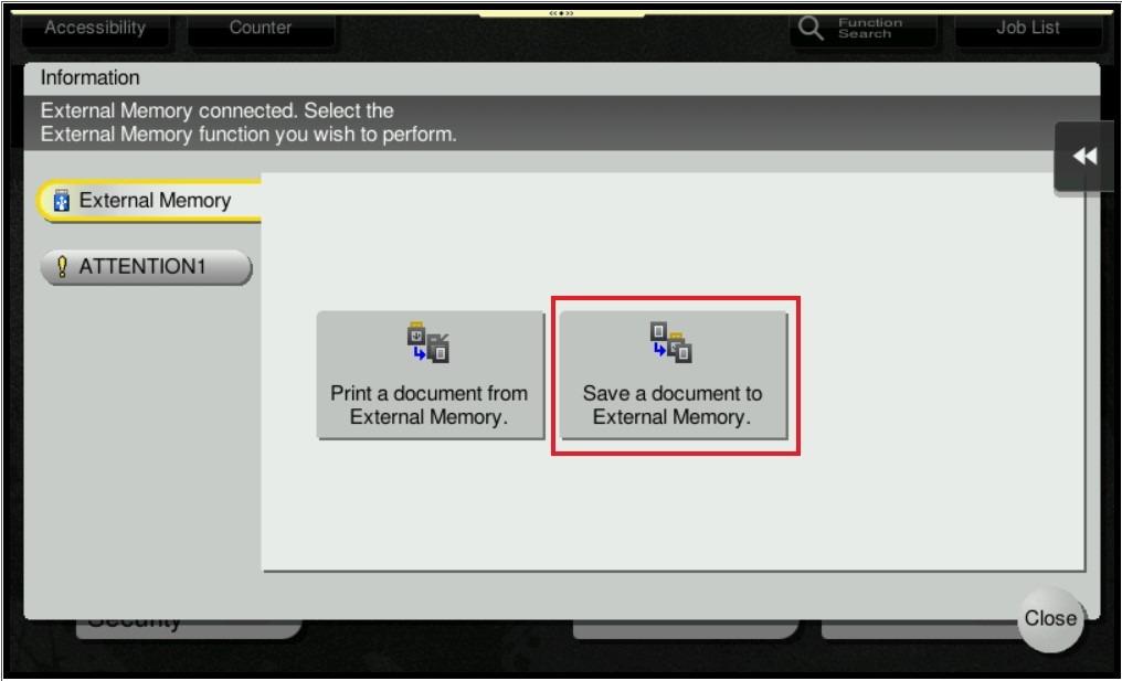 STEP 1(a) – After plug in Thumb Drive into machine, following message will appear, select [Save a document to External Memory].