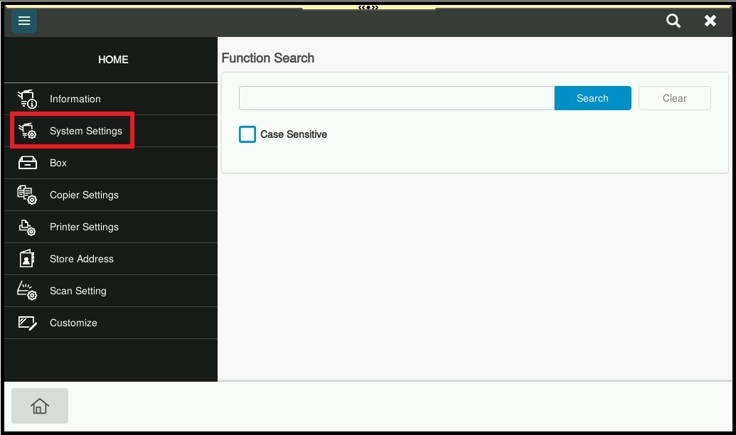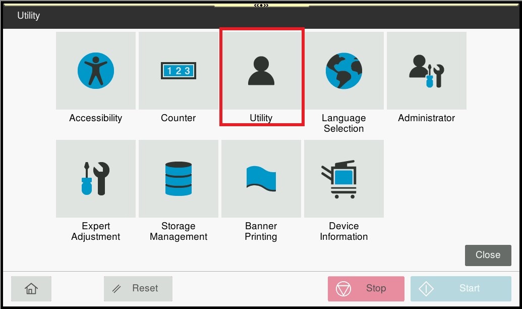 STEP 1 – On the Konica Minolta machine control panel, click on the [Home] button then select [Utility].