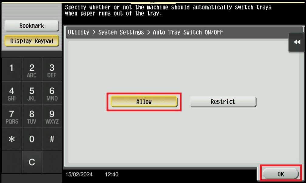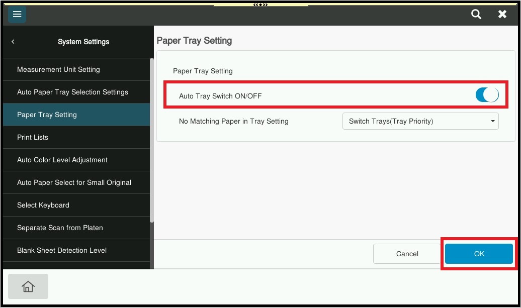 STEP 5 – Enable [Auto Tray Switch ON/OFF], then click [OK] to save the setting.