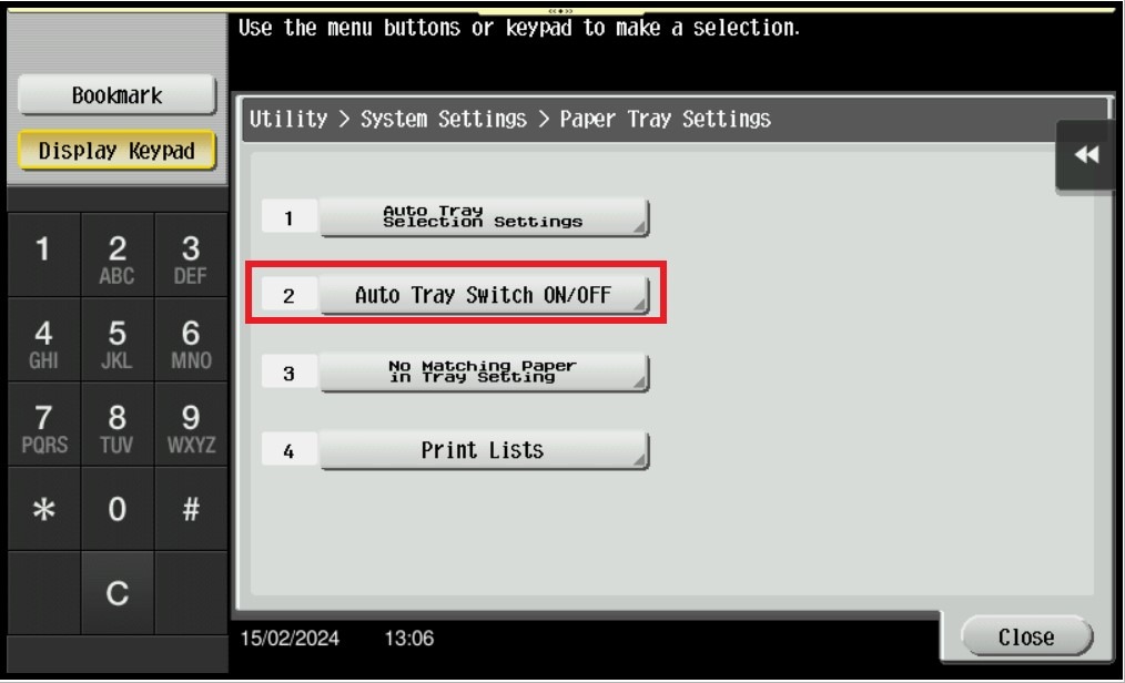 STEP 5 – Select [Auto Tray Switch ON/OFF].