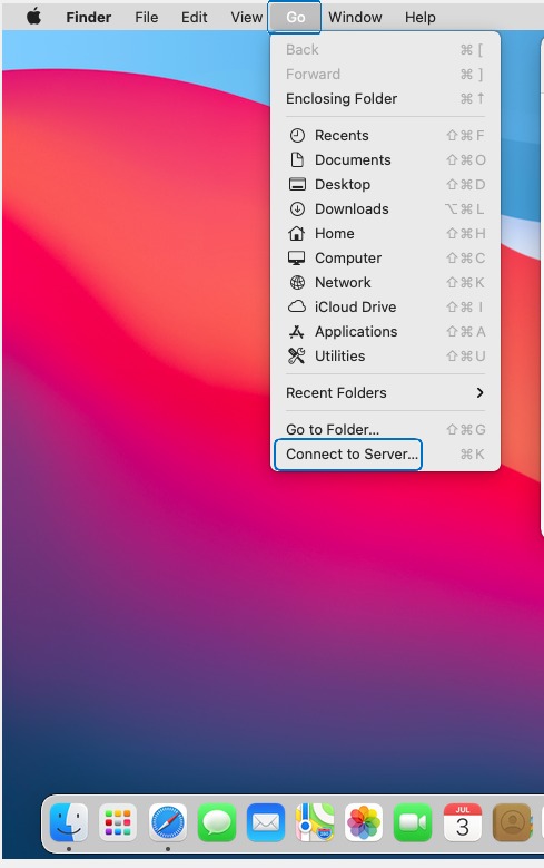 STEP 2: Create a new shortcut on the Home Folder by click on the Go and select Connect to Server.