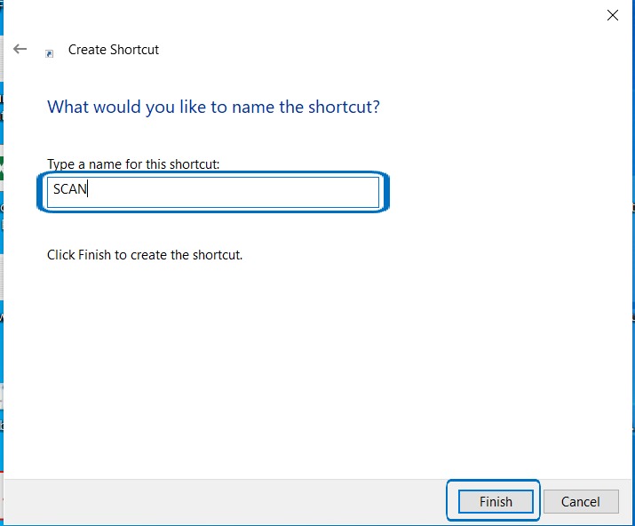 STEP 5: Rename the shortcut name and select Finish to save the share folder on the desktop. Test scanning to check if the document is visible on the mapped shortcut.