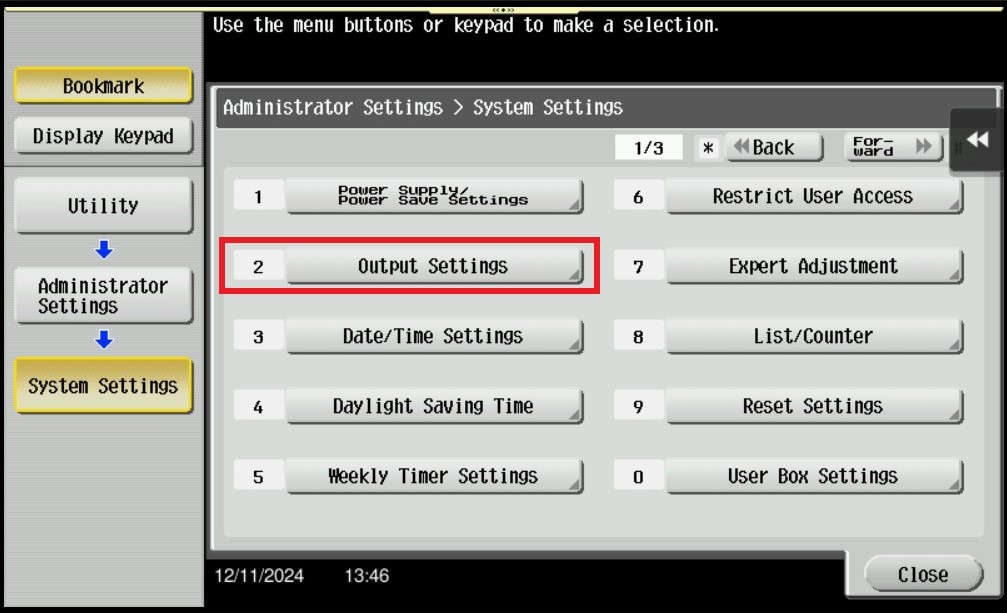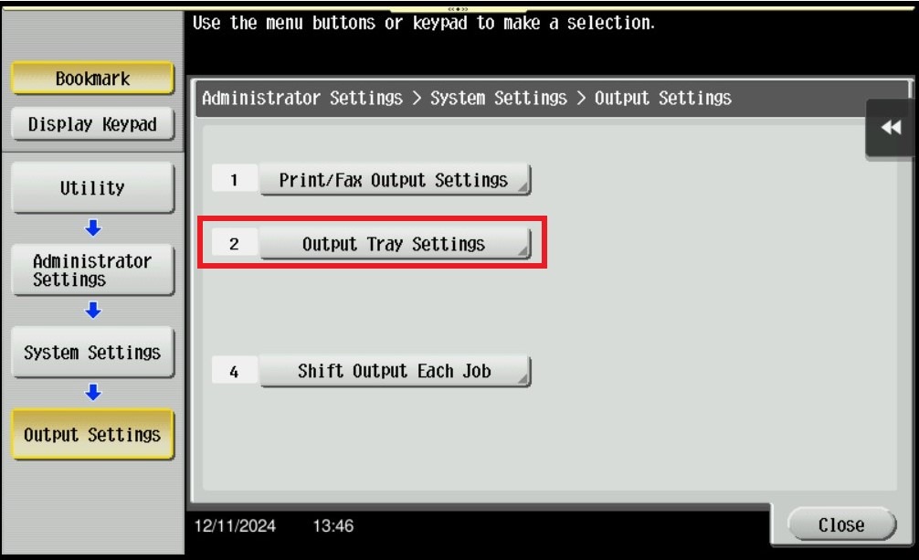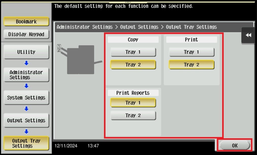 Suggestion on how to setup Output Tray on the machine. This will help us to select which tray to print out for Copy, Print or Print Report.