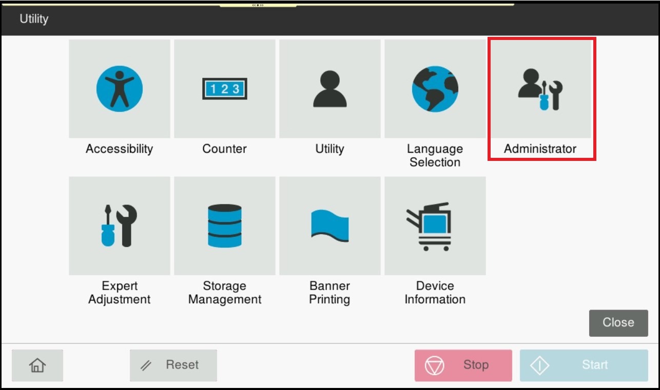 STEP 1 – On the Konica Minolta machine control panel, click on the [Home] button then select [Utility].