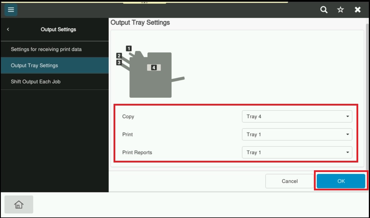 STEP 7 – Under the Copy, Print and Print Report, select the output tray(Tray 1/ Tray 2/Tray3/Tray4) to be printed out and then click [OK] to save the setting.