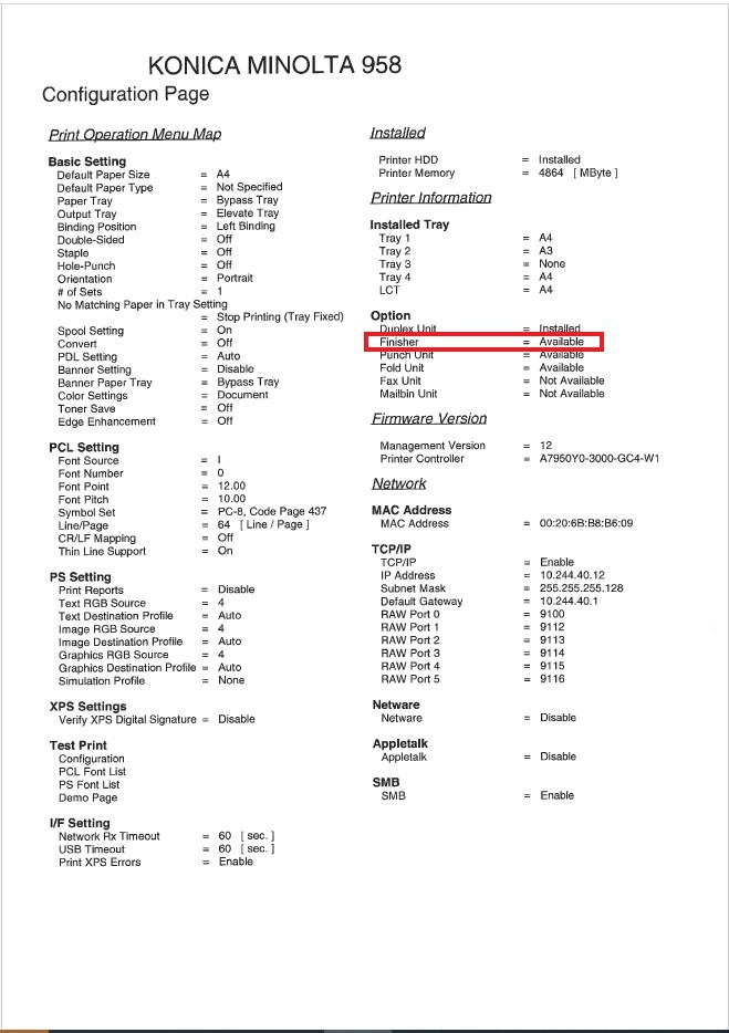 - Finisher– Optional Finisher that is required to use Output Tray in Konica Minolta Machine. Kindly click here on how to print configuration page on machine to check whether the Optional Finisher has been installed.