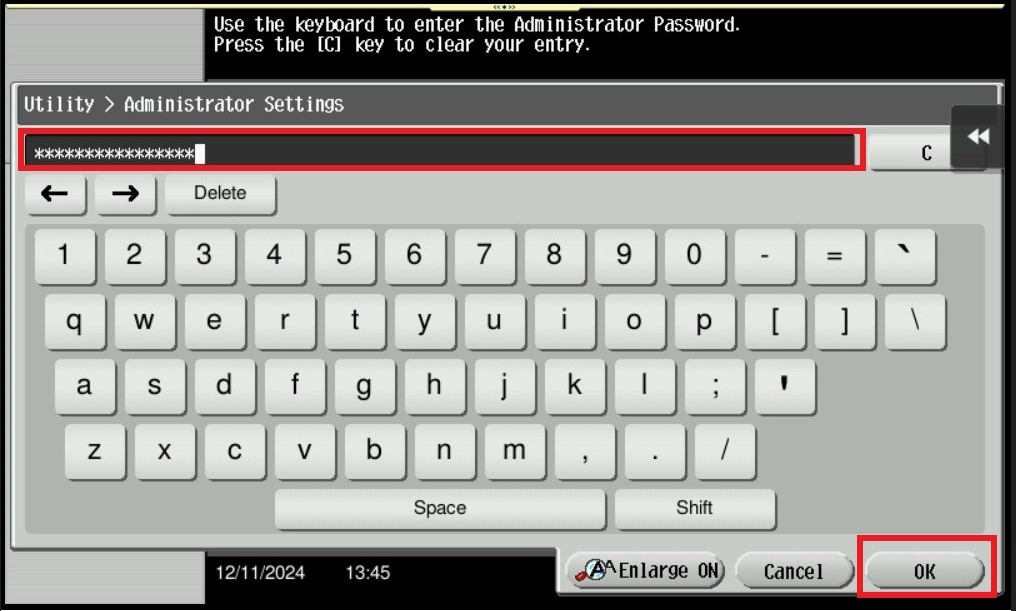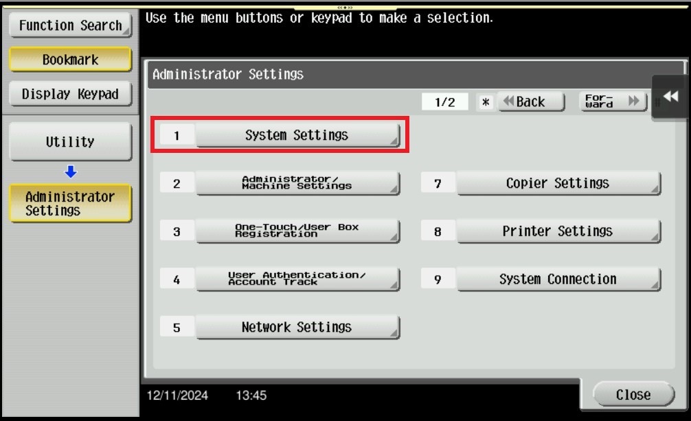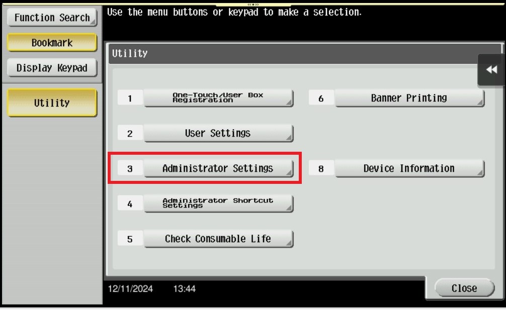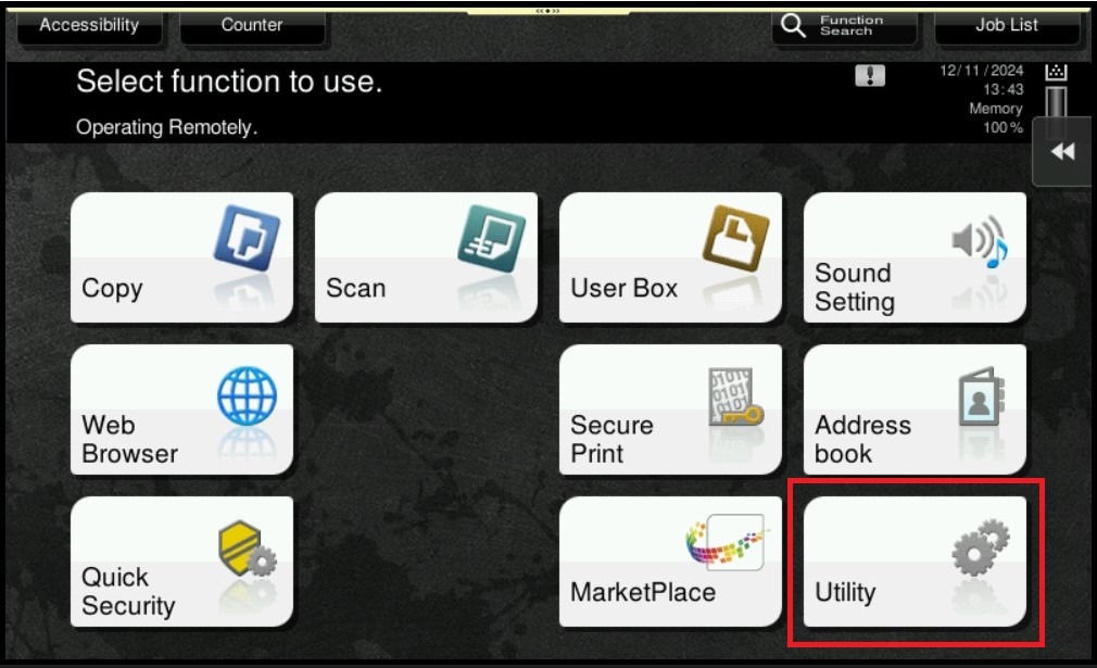 STEP 1 – On the Konica Minolta machine control panel, click on the [Menu] button then select [Utility].