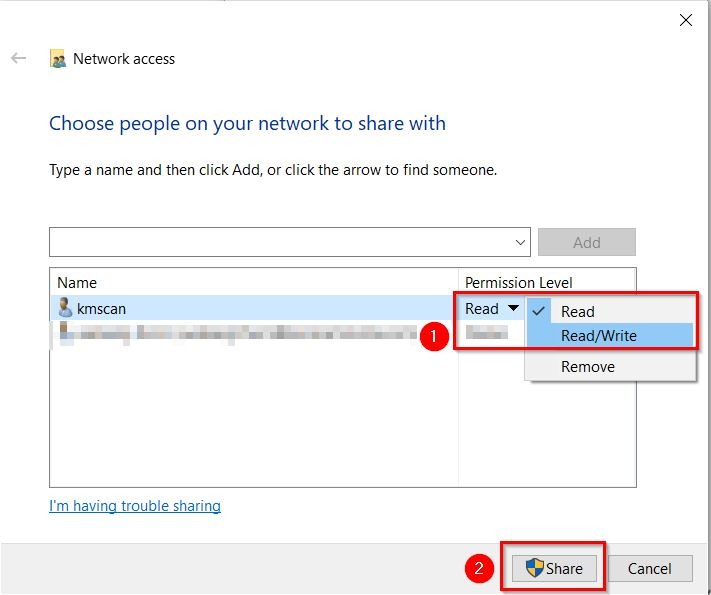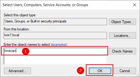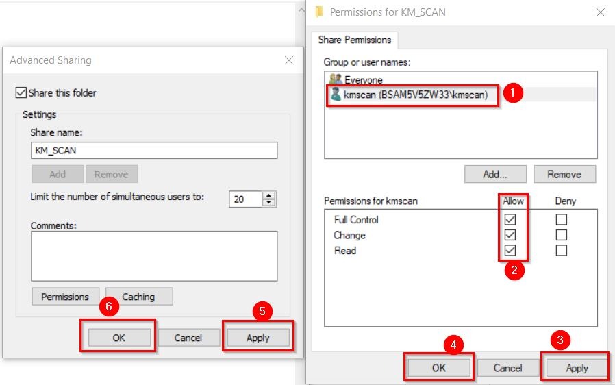 •  [Tick] again on the allow full control under dummy username kmscan. Click on [Apply] and [OK] twice to save the changes.