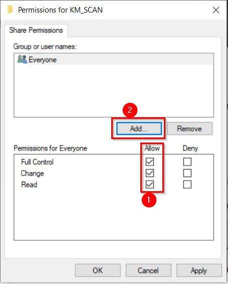 • Under the [Everyone] username, [Tick] on allow full control and click on [Add].