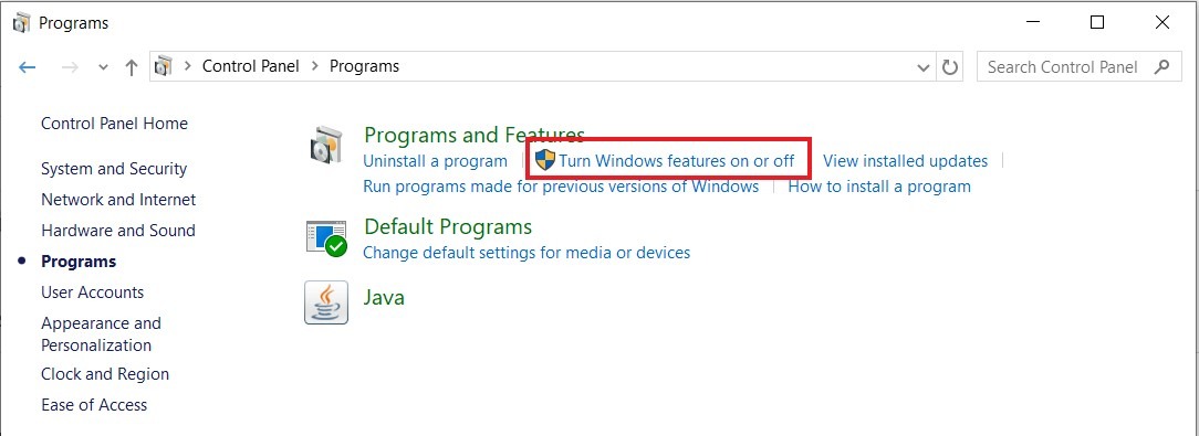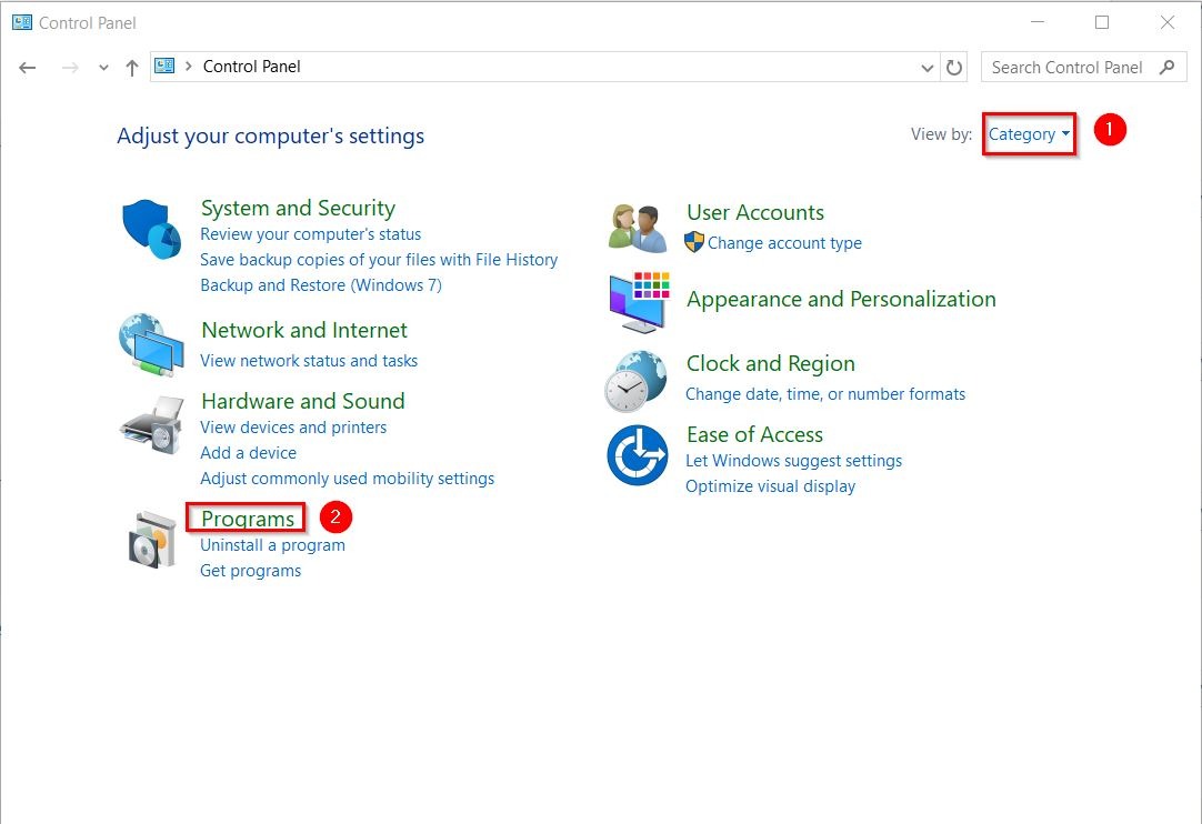 1. Navigate to [Category] – [Programs] – [Turn Windows features on or off].