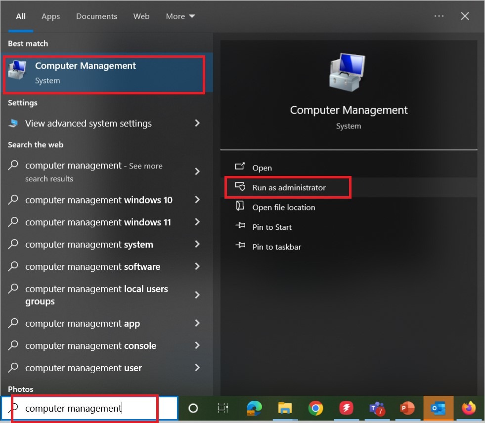 • Go to search window, type [Computer Management] and click on [Run as Administrator].