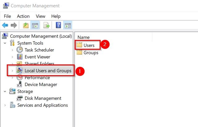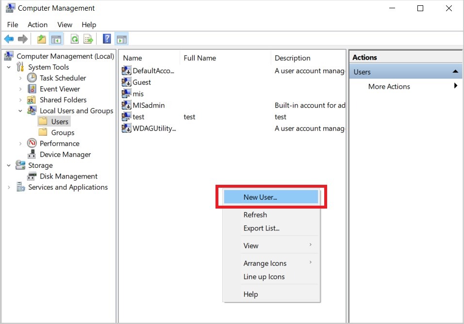 • On the left hand side, select [Local Users and Groups] – [Users]. Right click on the empty space and select [New User].
