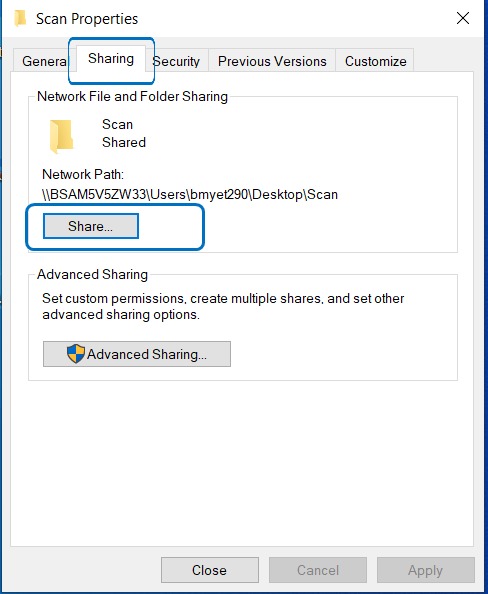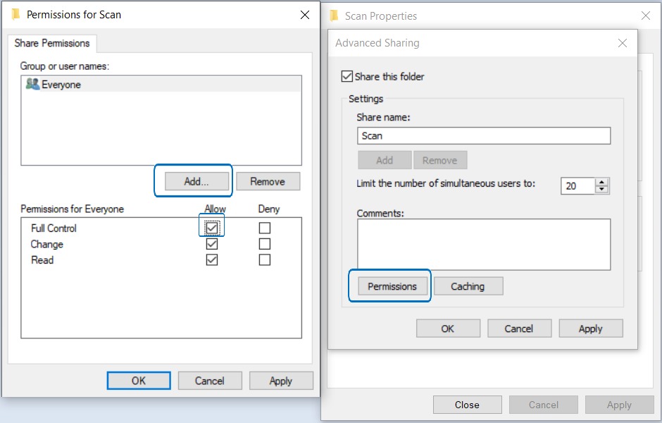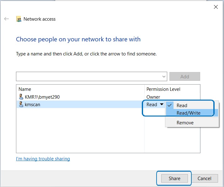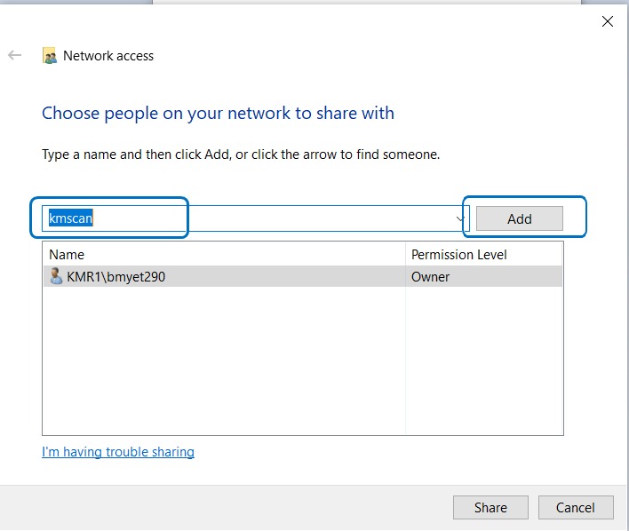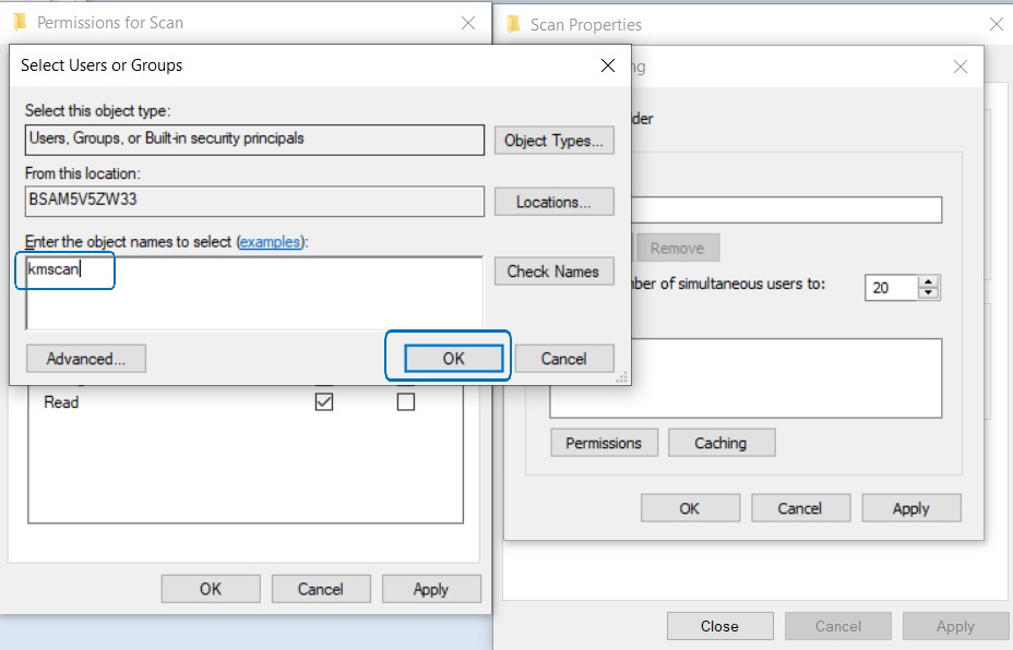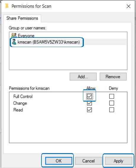 • The dummy user kmscan will appear on the Sharing user list. Tick again Allow full control under dummy user kmscan. Click on Apply and OK and again for Apply and OK to make changes.