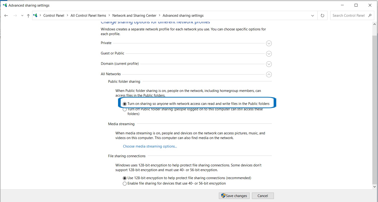 • Public Folder Sharing: Turn on Public Folder Sharing.