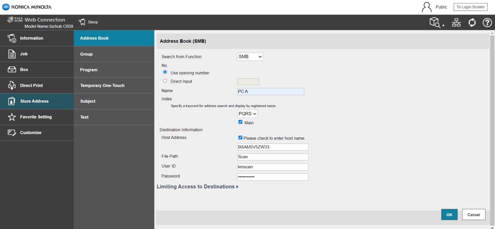 STEP 4 – Add the SMB details on the Konica Minolta machine Address Book:
