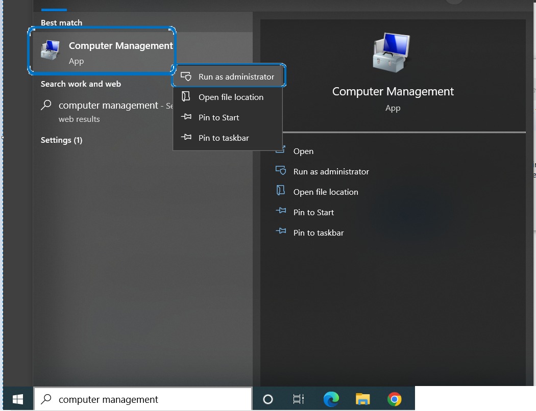 • Go to Search Window, type Computer Management, Right Click and Run as Administrator.
