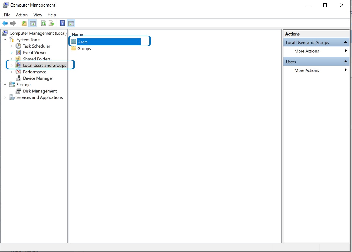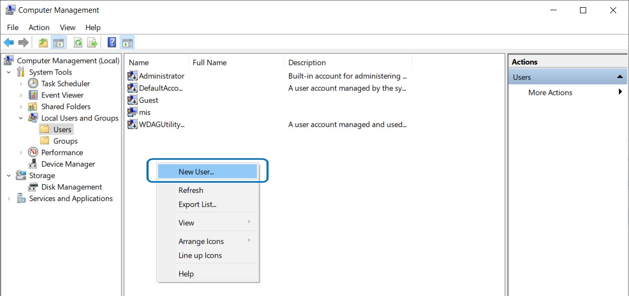 • On Left hand side, select Local Users and Groups > Users. Right click of the User List empty space, select New User.