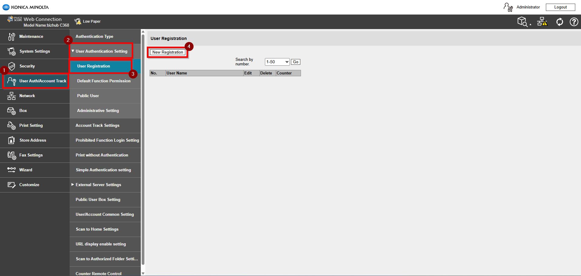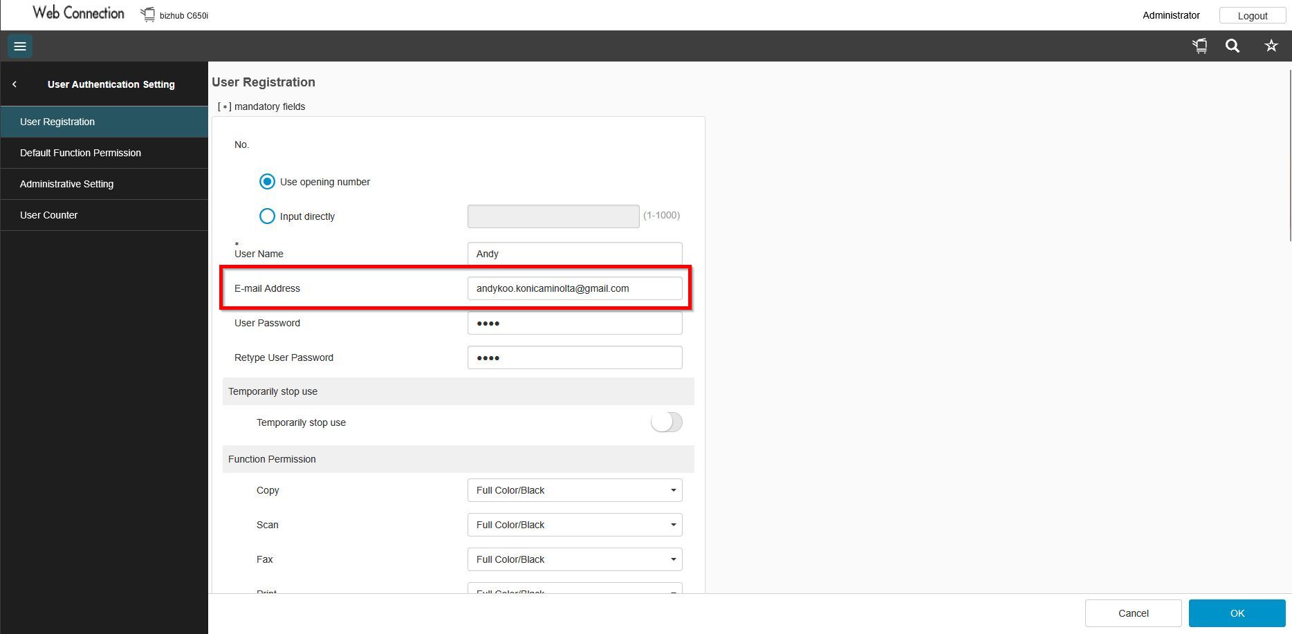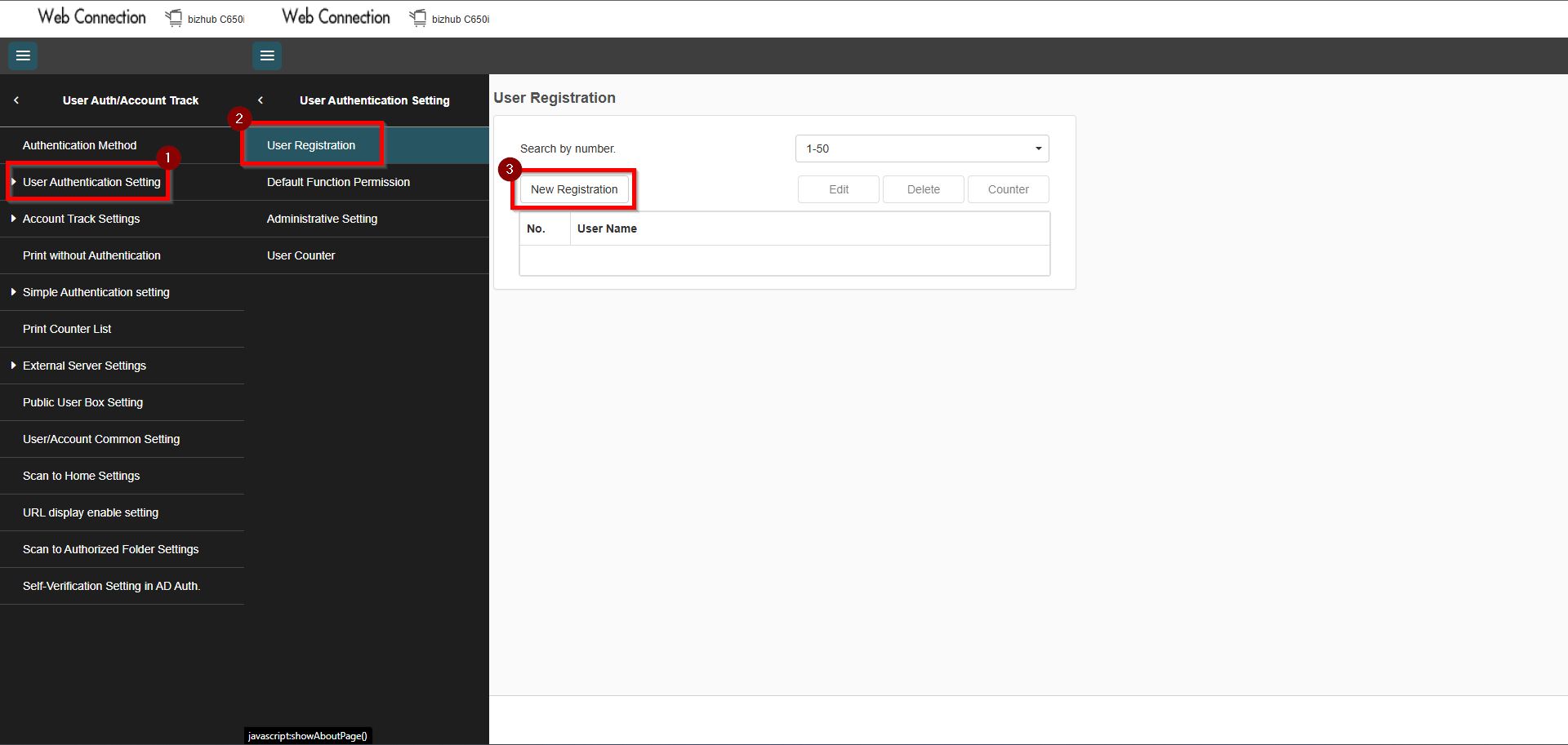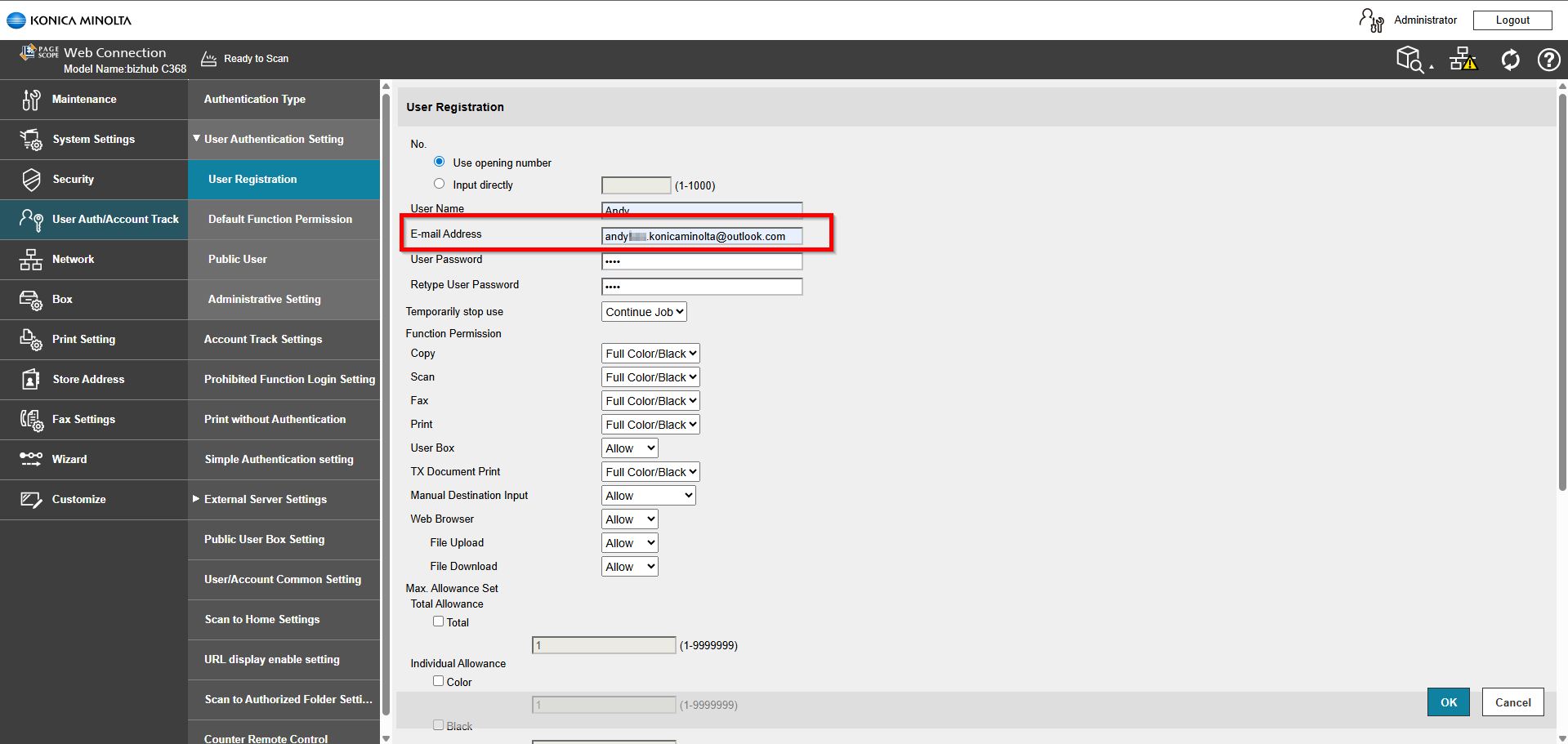 STEP 5 – After completing step above, select [User Auth/Account Track] [User Authentication Settings] – [User Registration] then click [New Registration] to register a user. Ensure that the email address is entered in the column.
