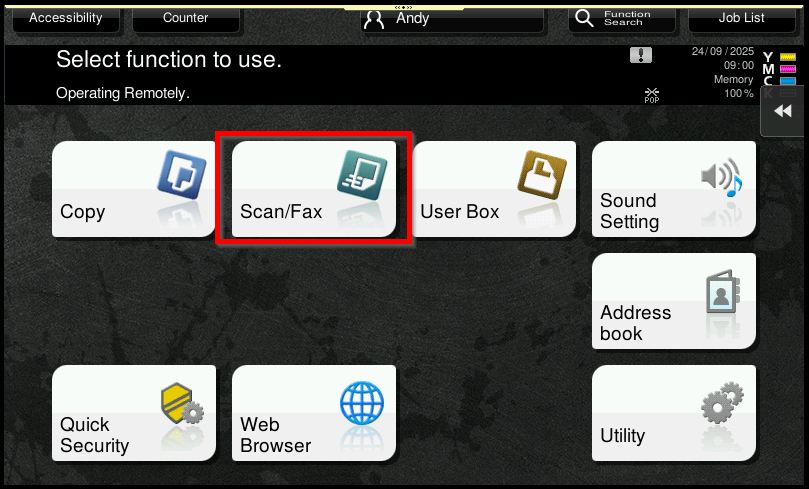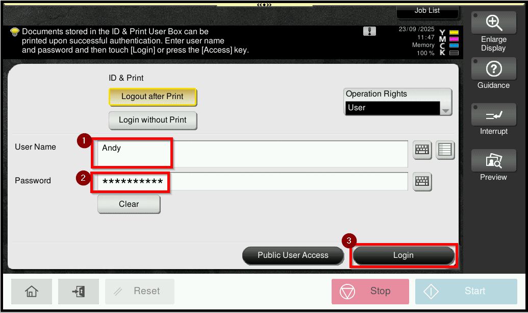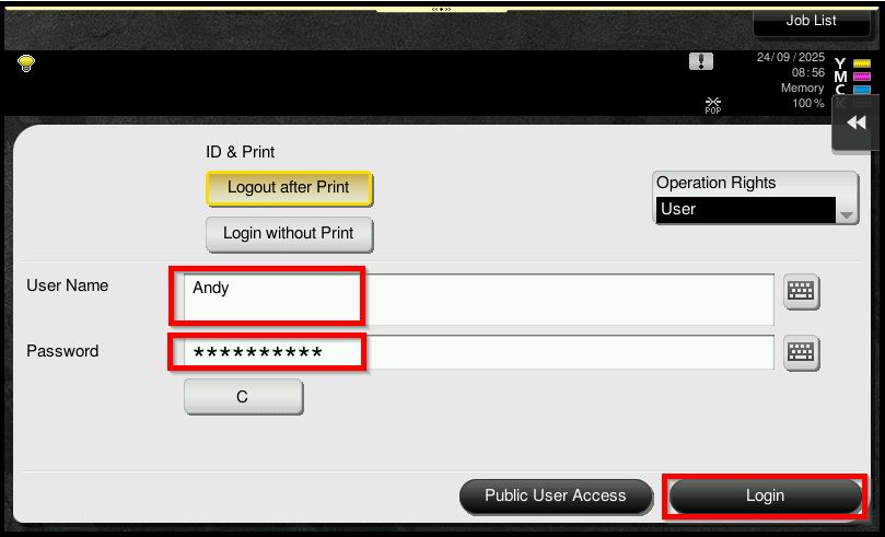 STEP 7 – After completing all the steps above, go to the photocopier machine panel and click on the [Access] button. Key in the username and password that registered and click on [Login].