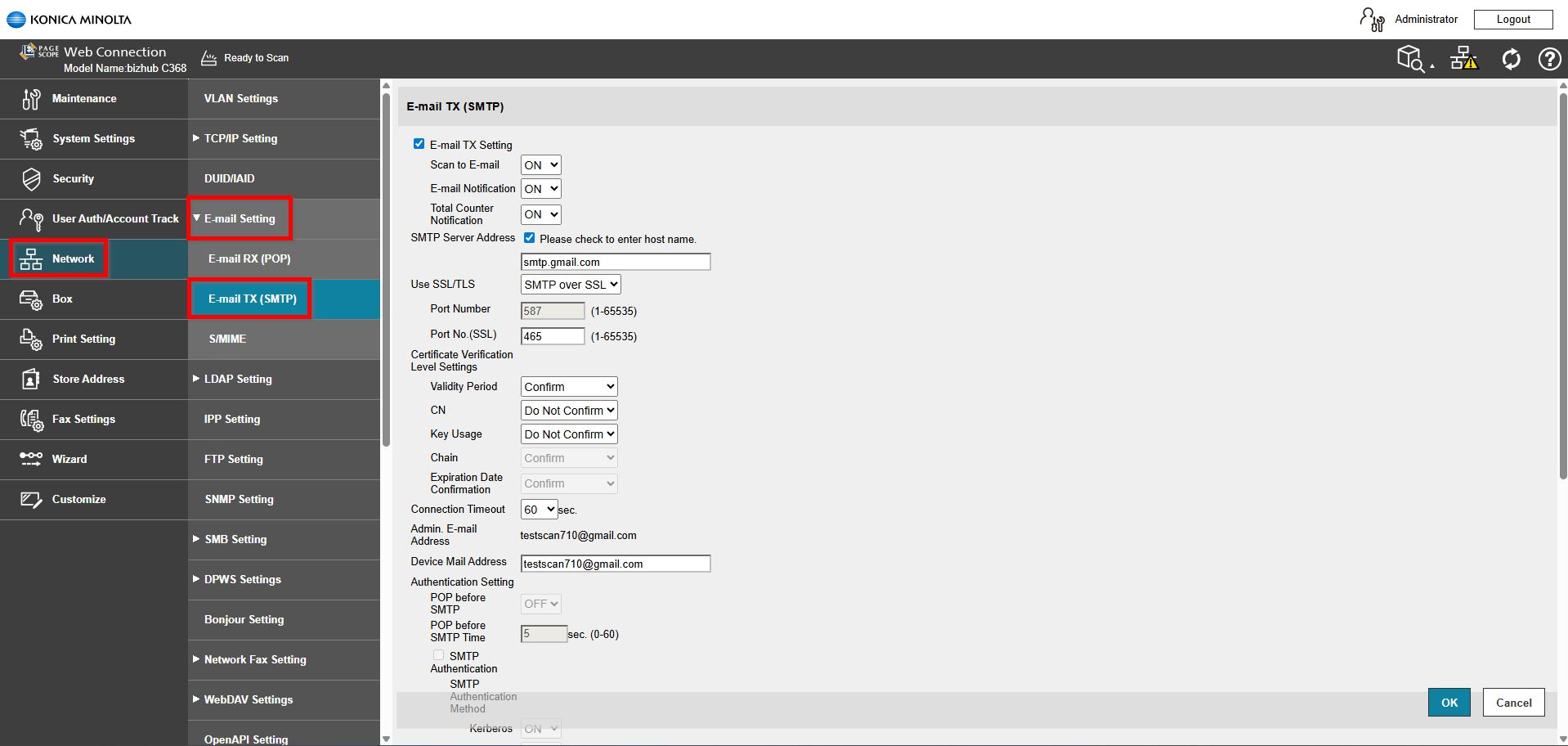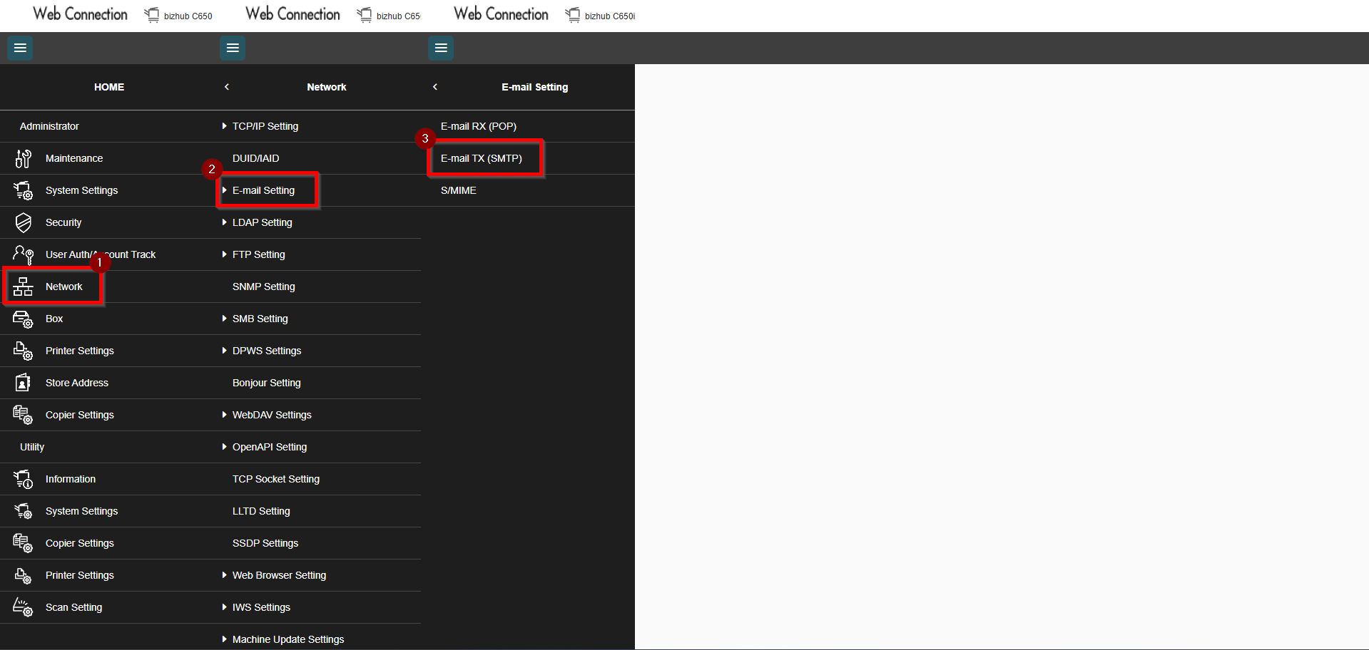 STEP 3 – Select [Network Settings] – [Email Settings] – [Email TX (SMTP)] to setup Scan to Email function.
