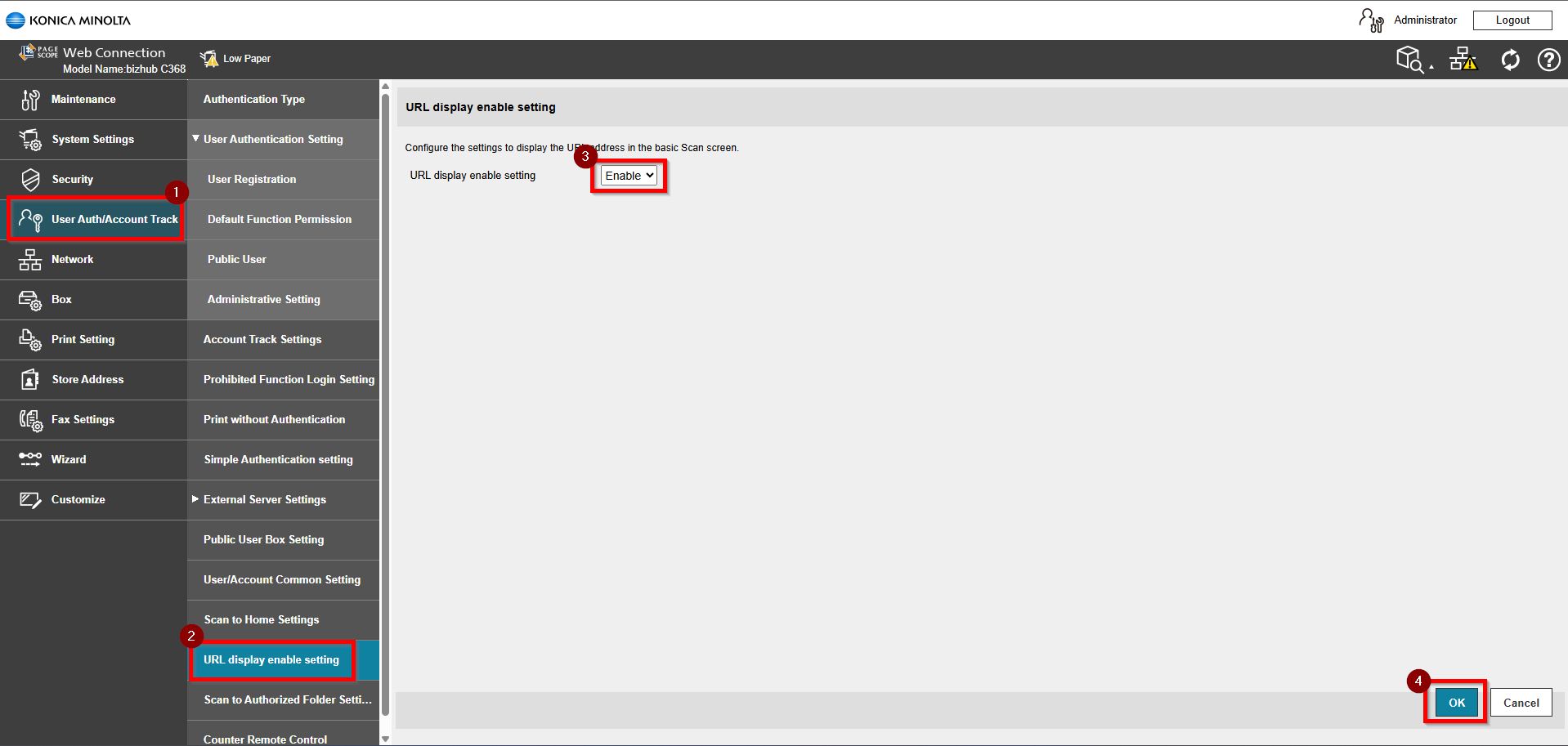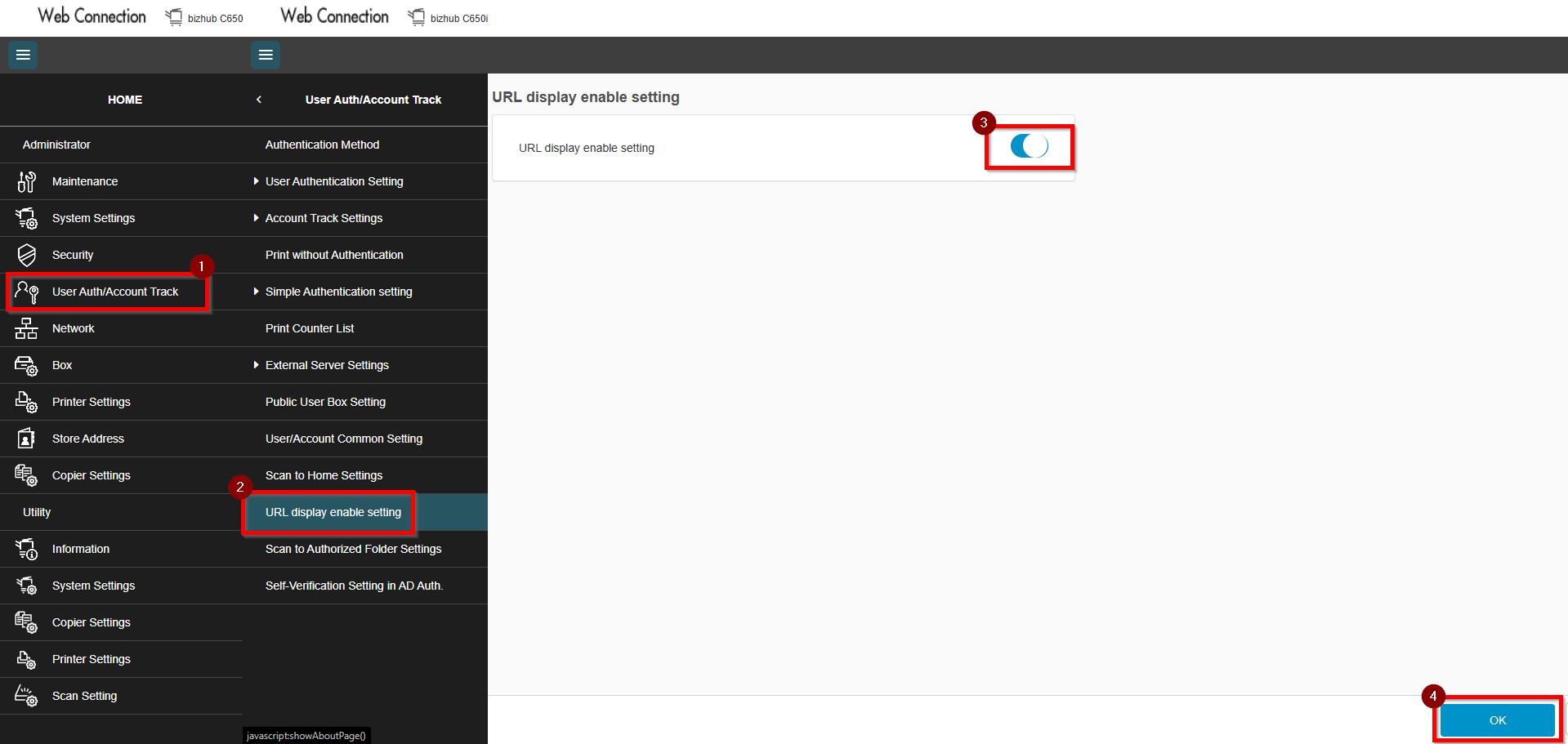 STEP 6 – After completing step above, select [User Auth/Account Track] [URL Display Enable Setting]. Ensure that the URL display enable setting is [Enable] then click [OK] to save.