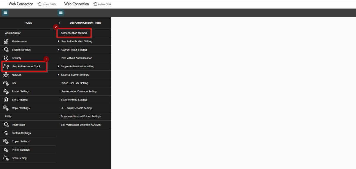 STEP 4 – After completing step above, select [User Auth/Account Track] – [Authentication Method] and set the User Authentication to [ON (MFP)].