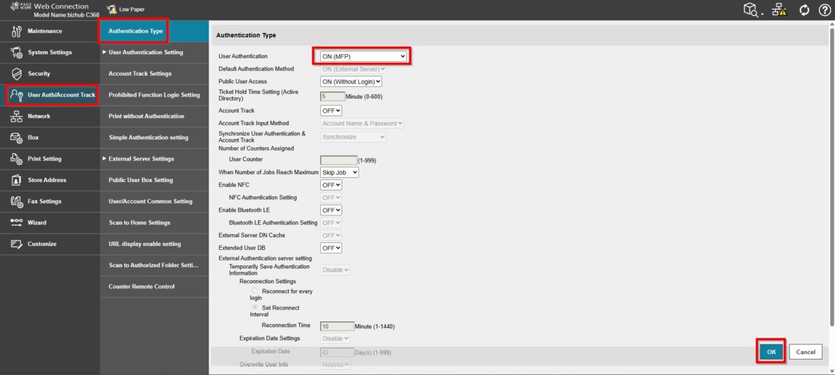 STEP 4 – After completing step above, select [User Auth/Account Track] – [Authentication Type] and set the User Authentication to [ON (MFP)].