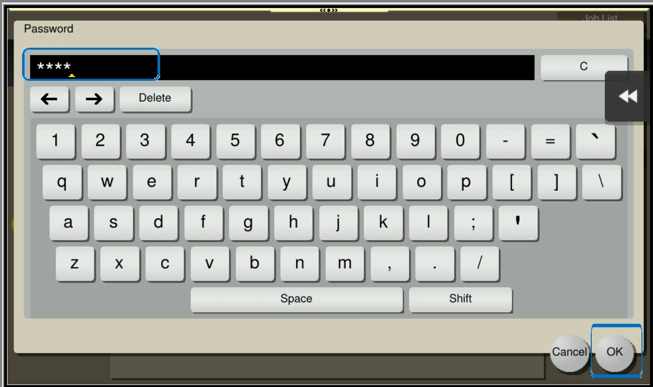 Important Note: If you are using Authentication on the machine (either User Authentication or Account Track), you need to login first using your printer ID and password before going to the Secure Print folder to retrieve the document.