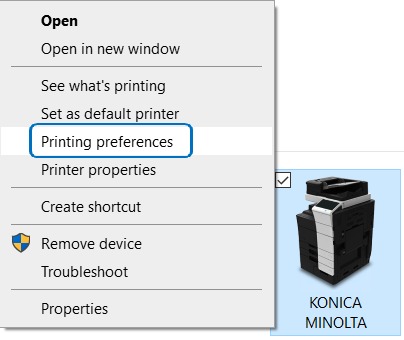 1. Go to Control Panel, Devices & Printers, right click of the Konica Minolta Printer, select Printing Preferences. Or if you are just using Secure Print on a single document, you can select Printer Properties on the application print option before printing the document.