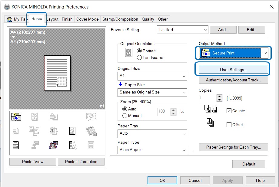 2. Select Basic Tab, change the Output Method to Secure Print and click on User Settings.