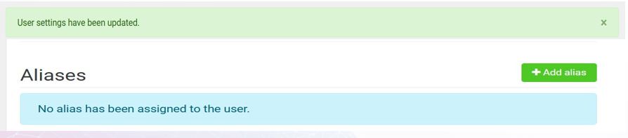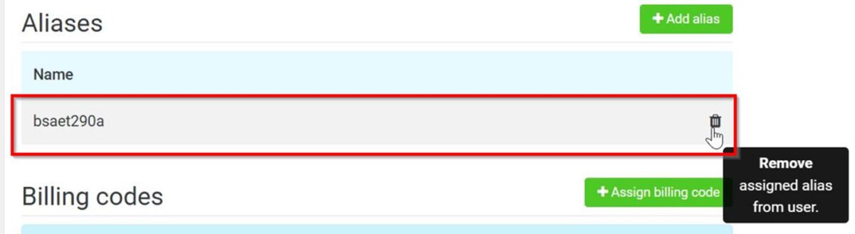 STEP 2 – Navigate to the [Aliases] settings and select the [Rubbish Bin] icon to remove the alias assigned to the user.