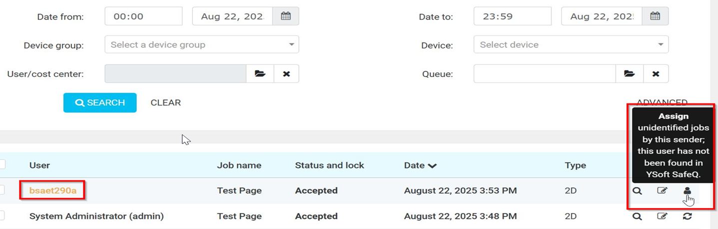 STEP 5 – Wait for few minutes, then try printing again from the computer. Login back to SafeQ Portal, go to [Reports], look for any job that is coming from specific computer, click on [Human Icon] to [Assign] unidentified jobs by this sender.