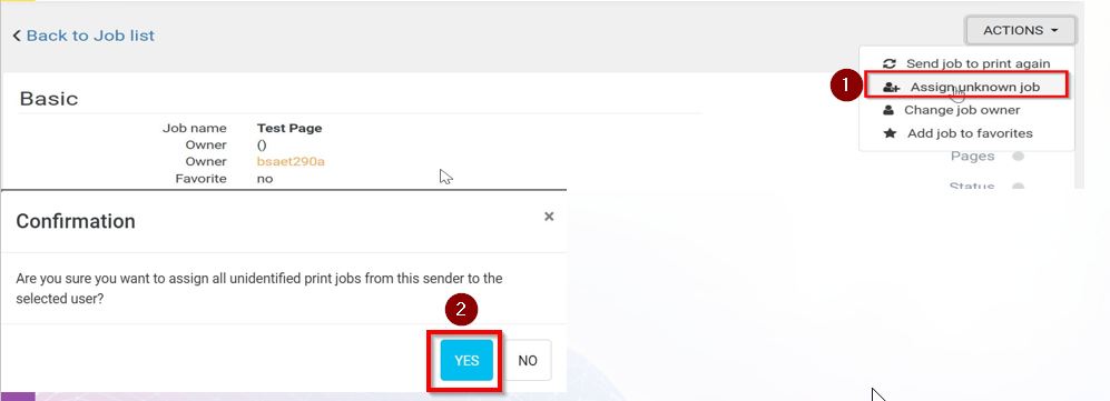 STEP 6 – Once the username has been found, kindly select [Actions][Assign unknown job], select [YES] to confirm assigning the printing jobs to this user.