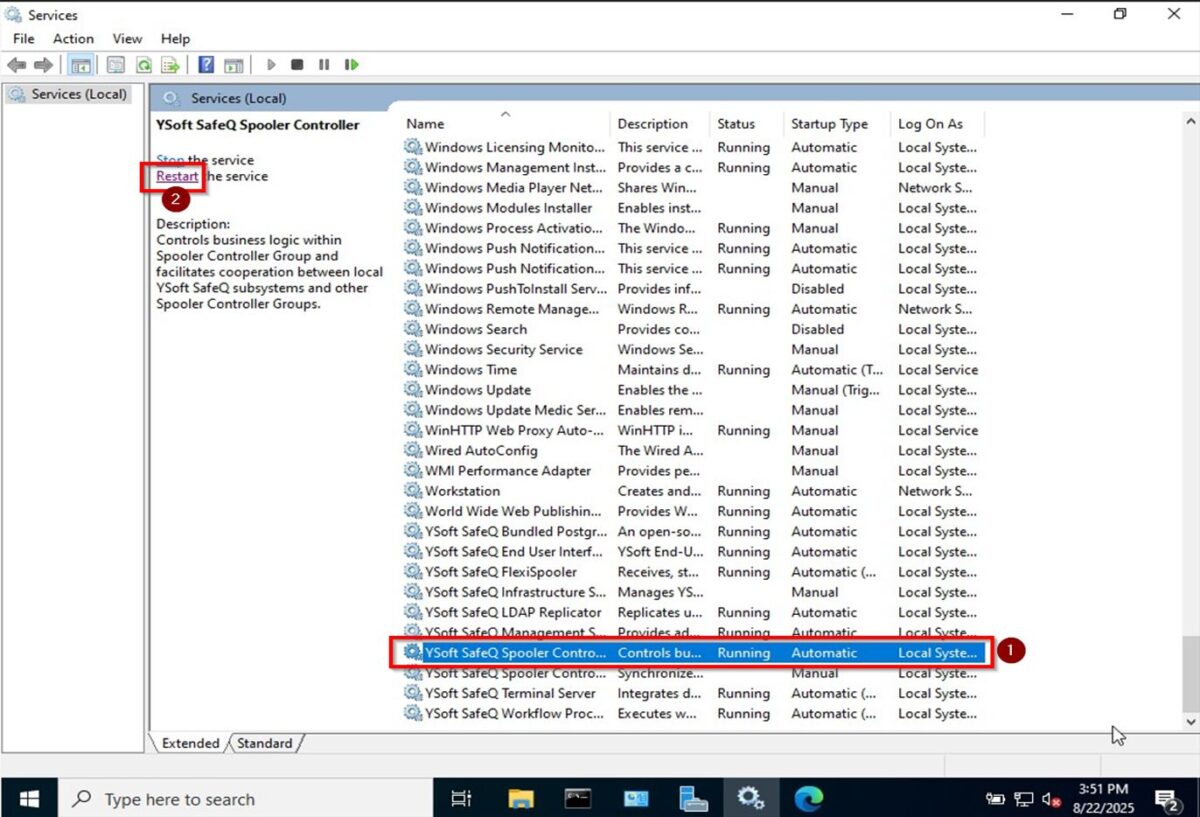 STEP 4 – Once the name has been removed, remotely to the SafeQ Server. Navigate to [Services][Ysoft SafeQ Spooler Controller], then click [Restart] to apply the changes to the user settings in the SafeQ Portal.