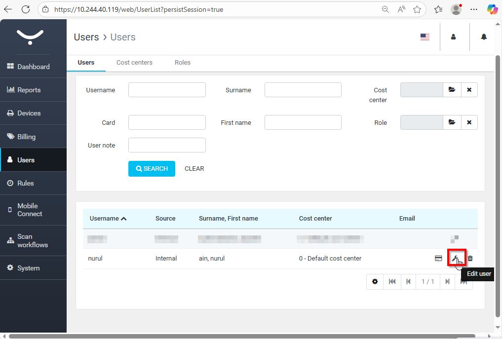 STEP 1 – Sign in to the SafeQ Portal with an admin account. Navigate to [Users] and select the [Edit] option for the user whose previously stored alias you wish to modify.