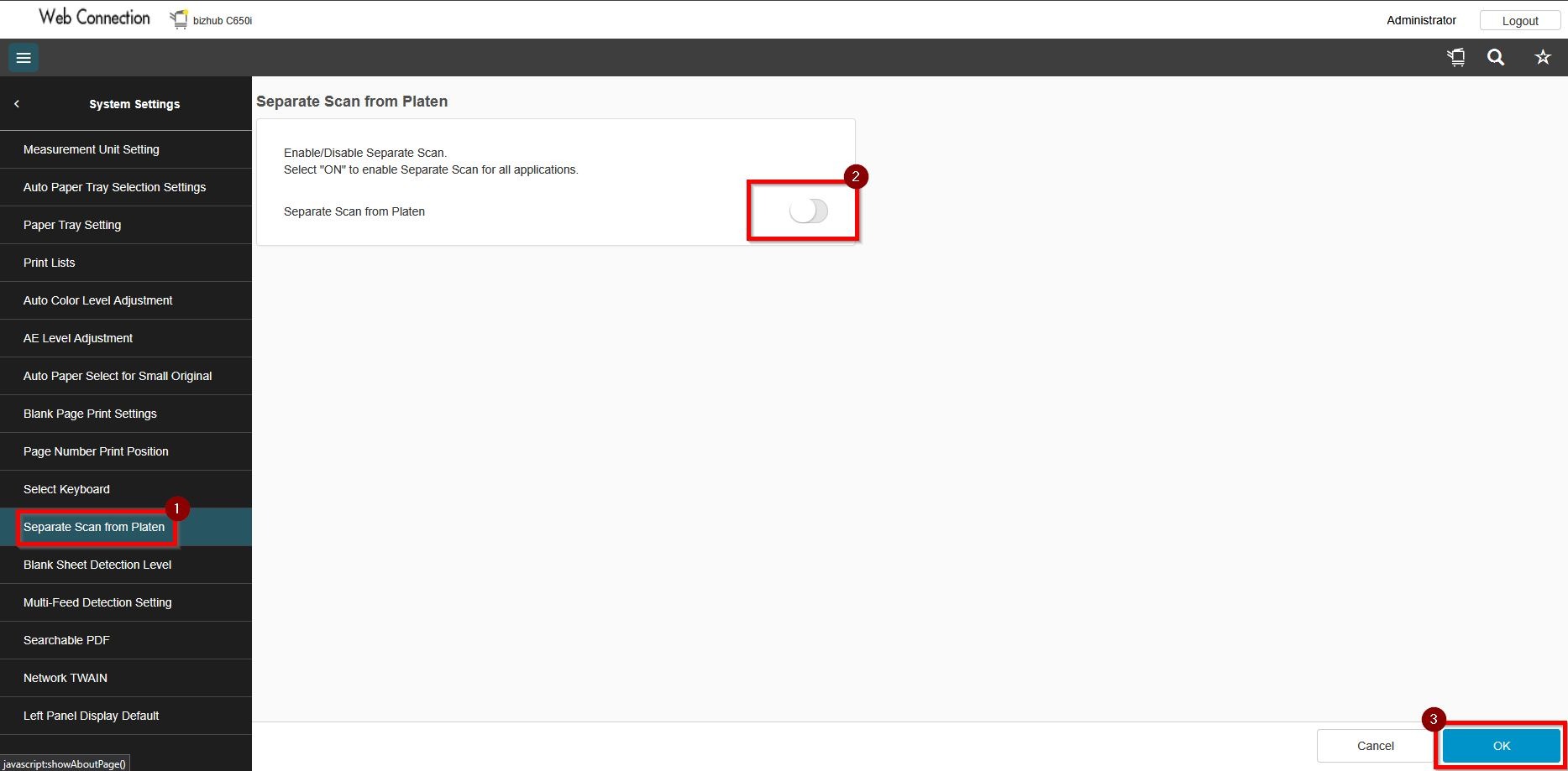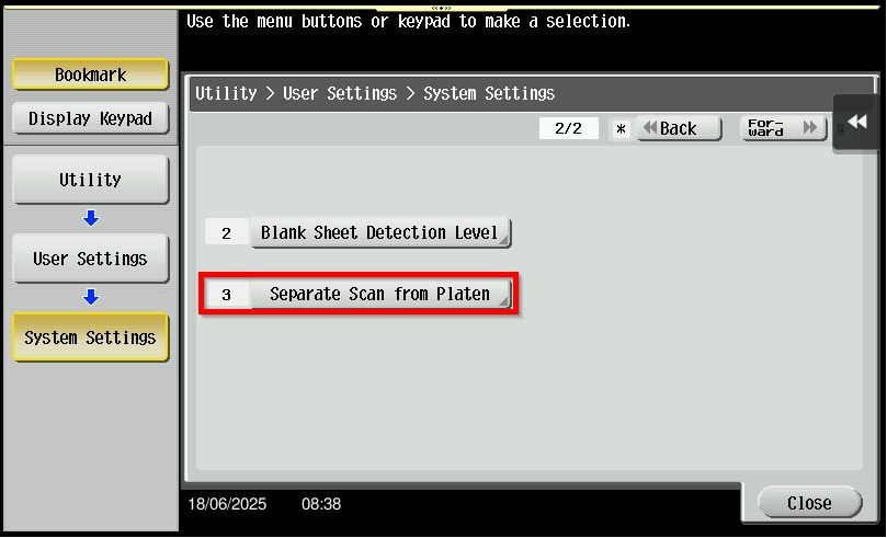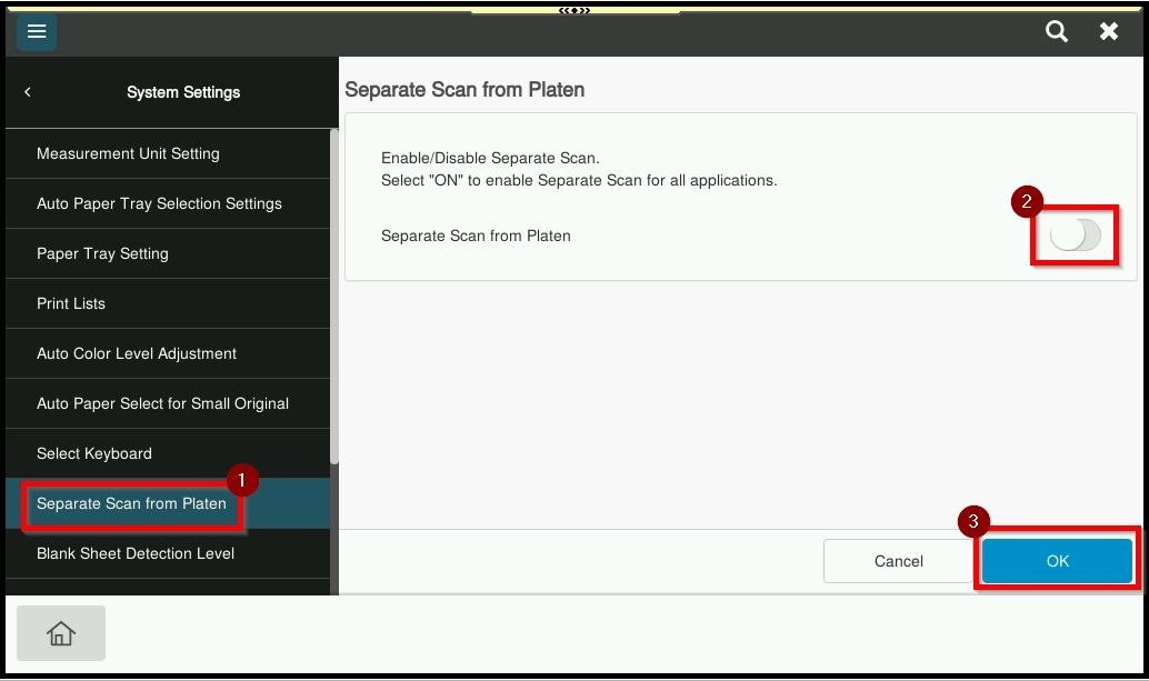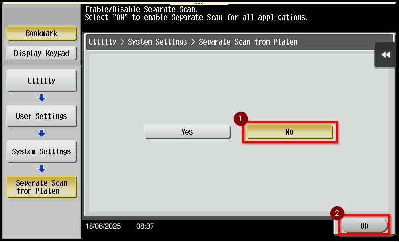 STEP 5 – Select [Separate Scan From Platen] – [NO] and click [OK] button to save.