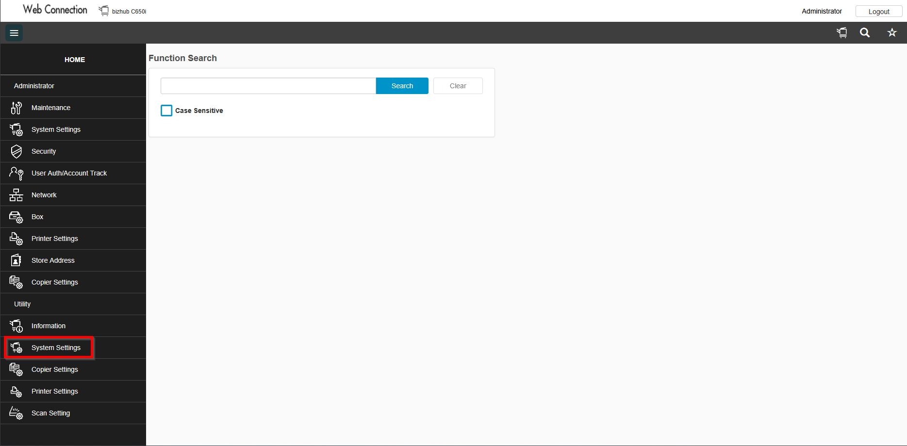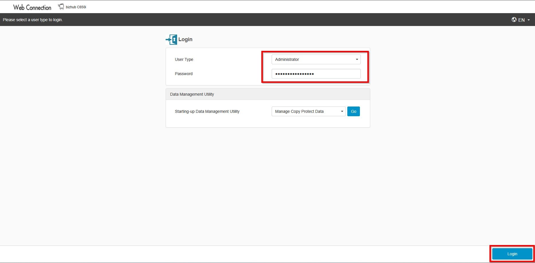 STEP 1 – Access to web connection via machine IP Address. Click on this to check how to get the IP Address from machine, then key in Konica Minolta Machine IP Address at web browser and log in as admin on the Web Connection.