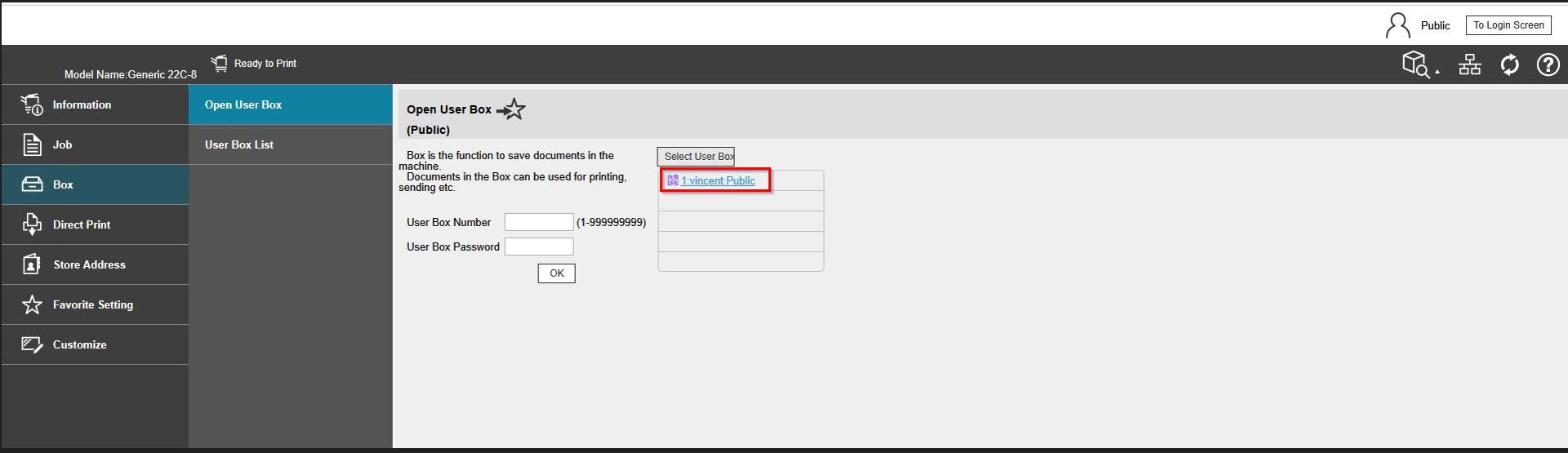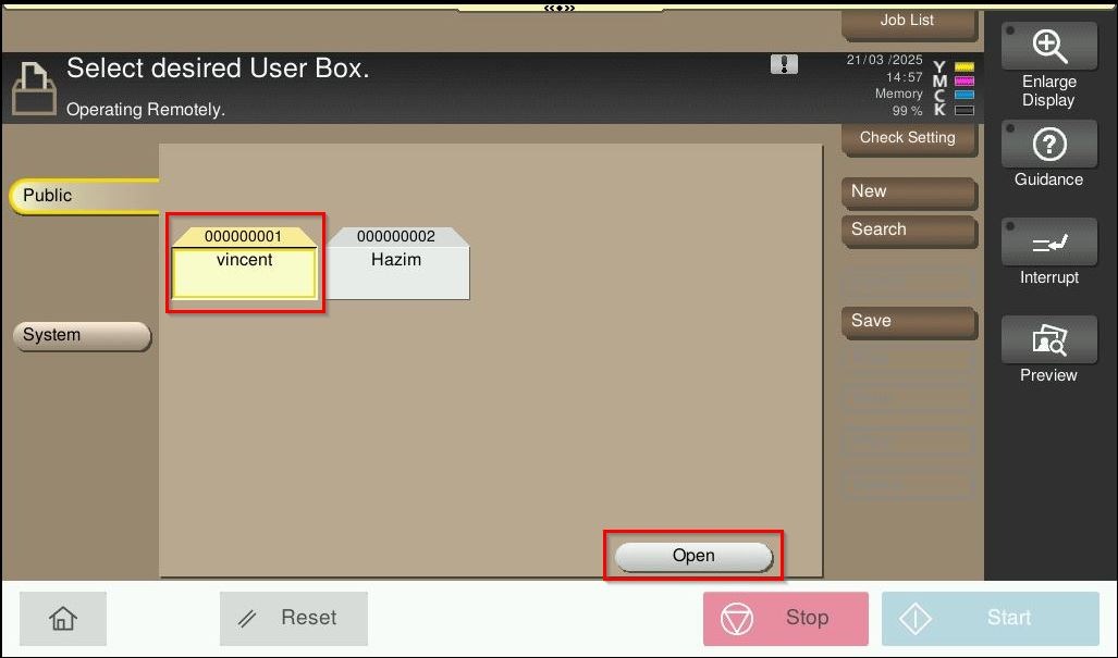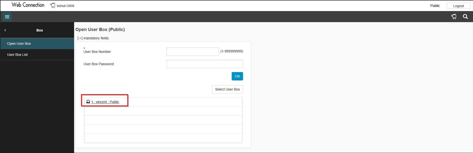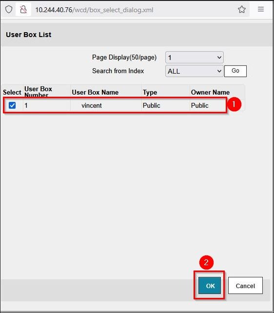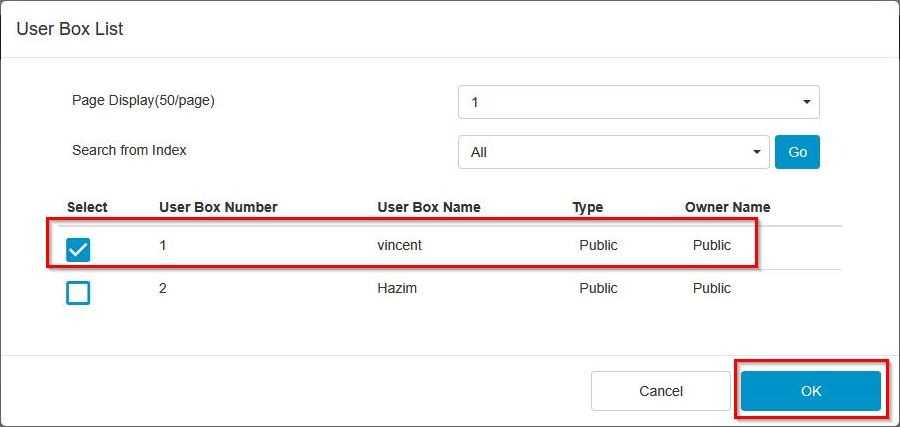 STEP 3 – Select the user box name and click [OK] to open the user box.