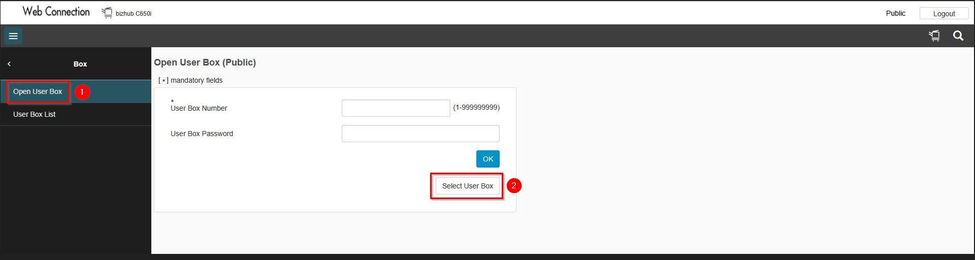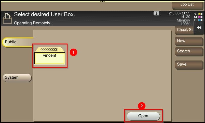 STEP 2 – Select [Box] – [Open User Box] – [Select User Box].